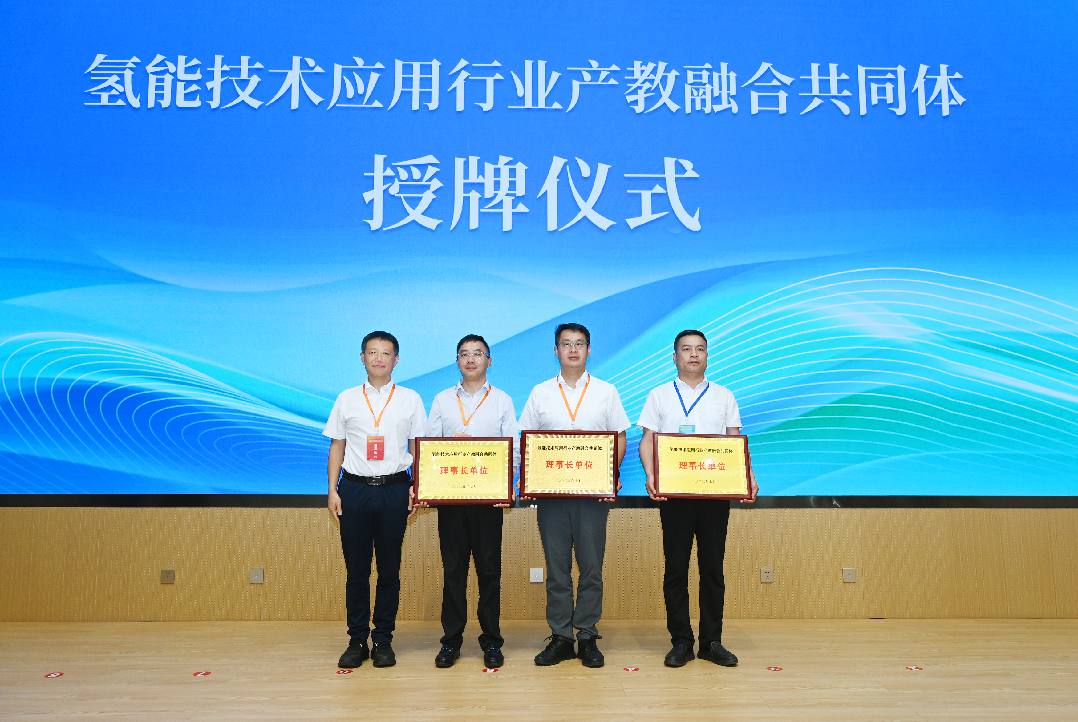 启动仪式上,与会领导共同点亮启动球,宣布氢能技术应用行业产教融合共同体正式成立。大会公布了共同体理事会成员单位名单,并为理事长单位、副理事长单位授牌。