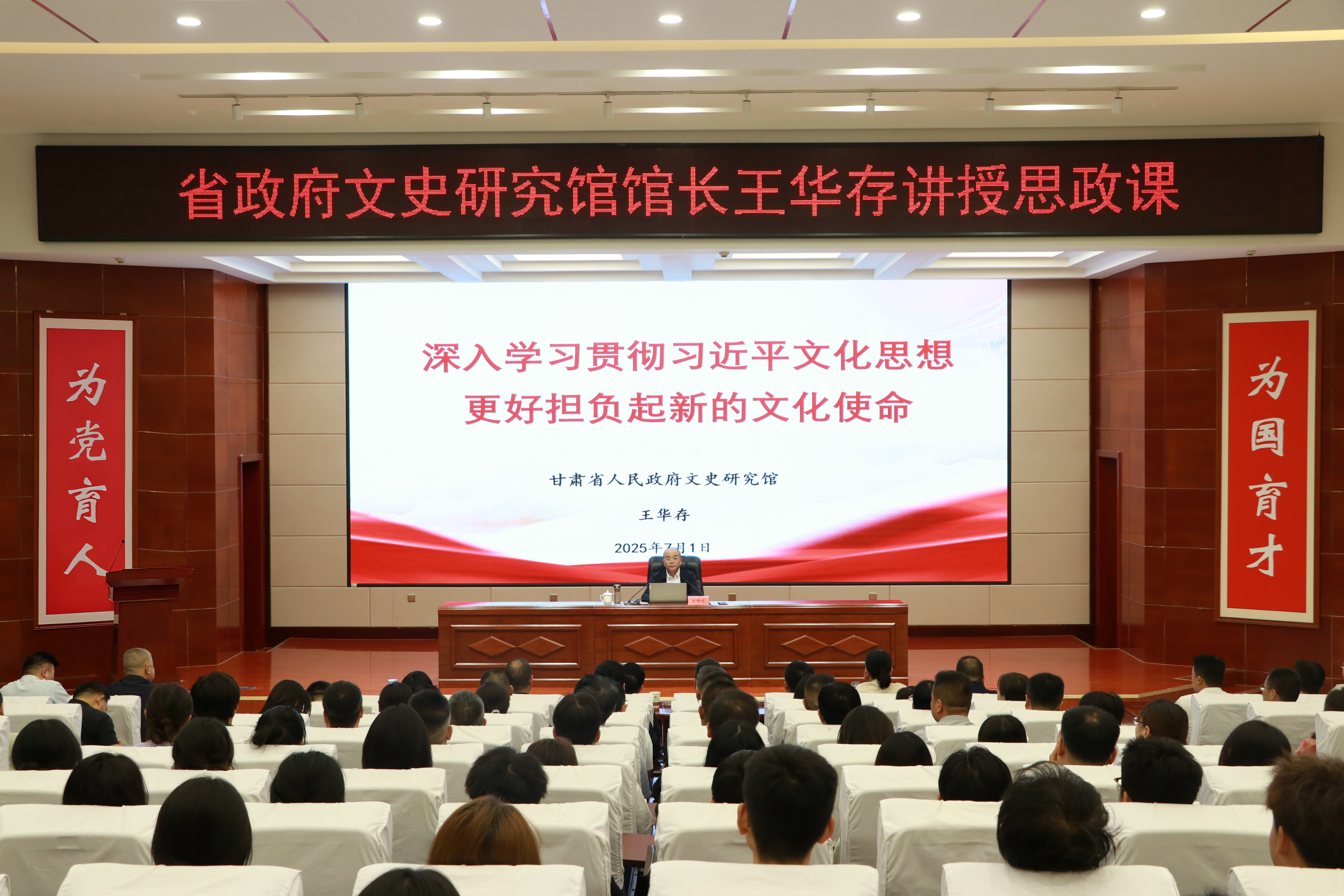 7月1日,在全校上下喜迎中国共产党成立104周年之际,甘肃省人民政府文史研究馆党组书记、馆长王华存到学校为师生讲授思想政治理论课。王华存以“深入学习贯彻习近平文化思想 更好担负起新的文化使命”为题,从深刻认识习近平文化思想的形成过程、习近平文化思想的丰富内涵和核心要义、甘肃文化历史简述、当代青年如何更好担当起新的文化使命四个方面对习近平文化思想进行了全面解读。党委书记王宏主持,学校领导、中层管理干部及师生代表共200余人到场聆听。
