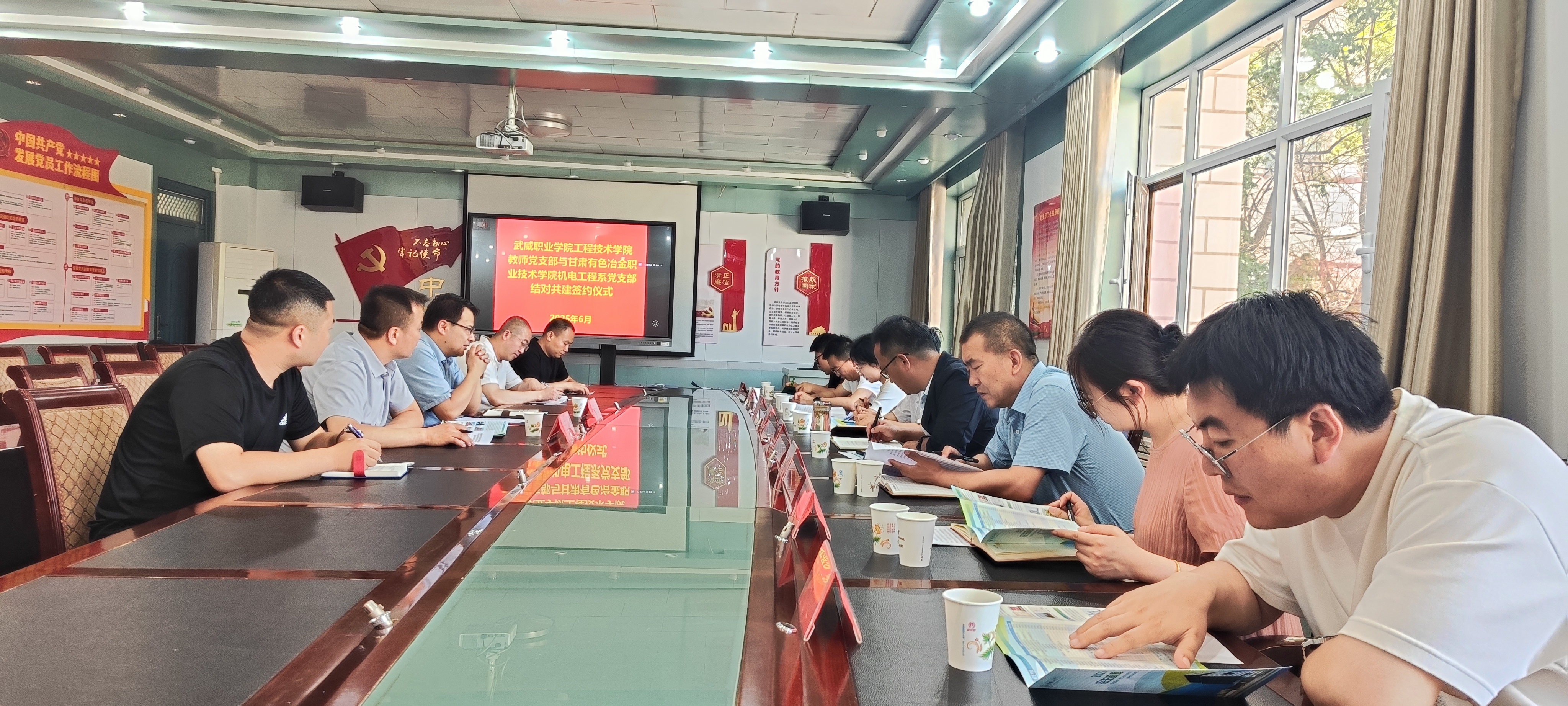 为进一步加强党组织建设,提升党员的政治素养和党性修养,6月11日,学校工程技术学院教师党支部和甘肃有色冶金职业技术学院机电工程系党支部结对共建签约仪式在博学楼党员活动室举行。甘肃有色冶金职业技术学院组织部部长高立兵、督导中心主任赵登峰、机电工程系党支部书记侯婷婷,学校工程技术学院党总支书记王铎云、副院长徐生龙出席仪式,双方党员共计20人参加仪式。