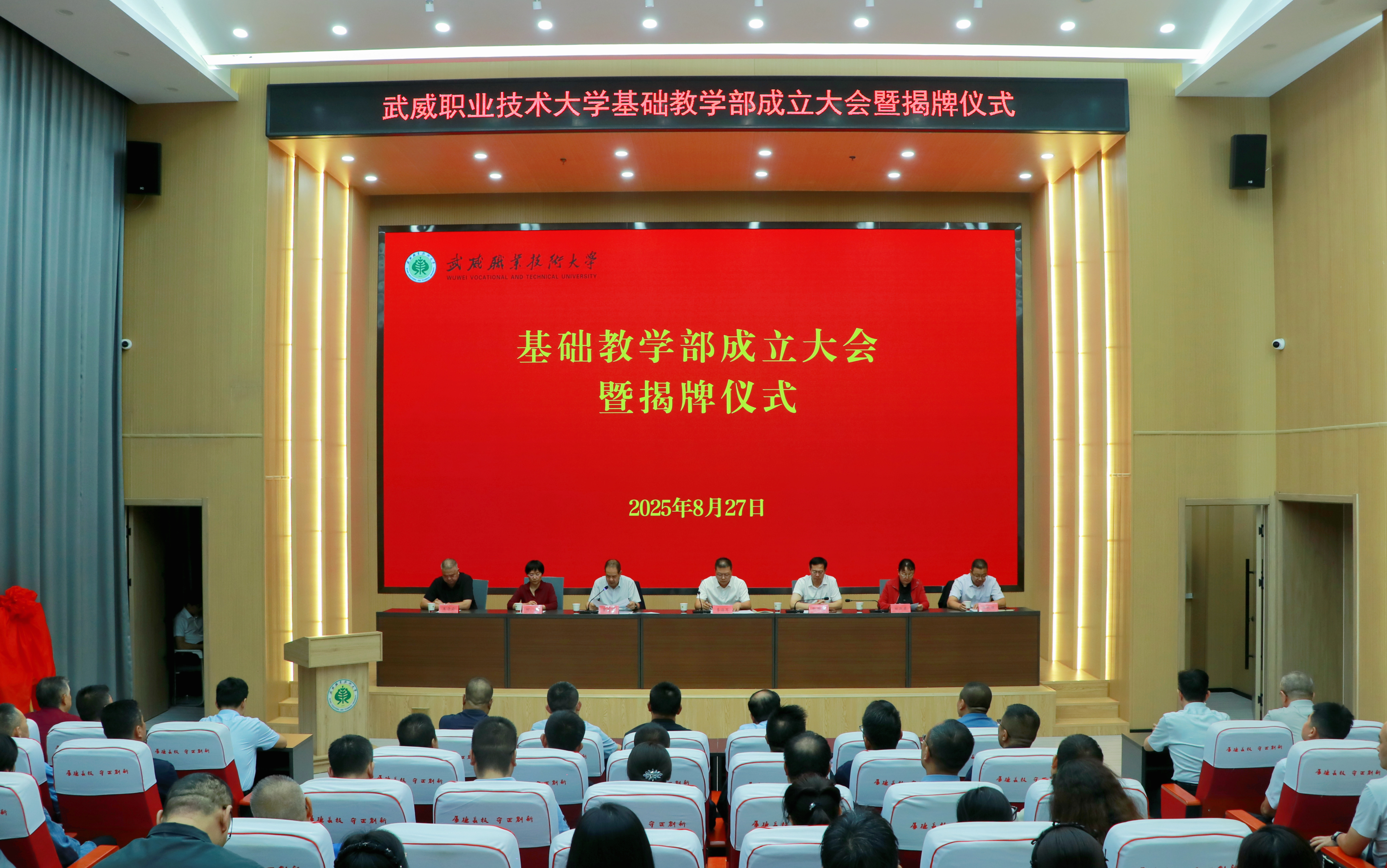 8月27日,武威职业技术大学在能源科技楼一楼学术报告厅举行基础教学部成立大会暨揭牌仪式。校长李海军出席会议并讲话,在家校领导、学校各职能部门、学院(部)负责人以及基础教学部专兼职教师共110人参加会议。党委副书记翟存祥主持会议。