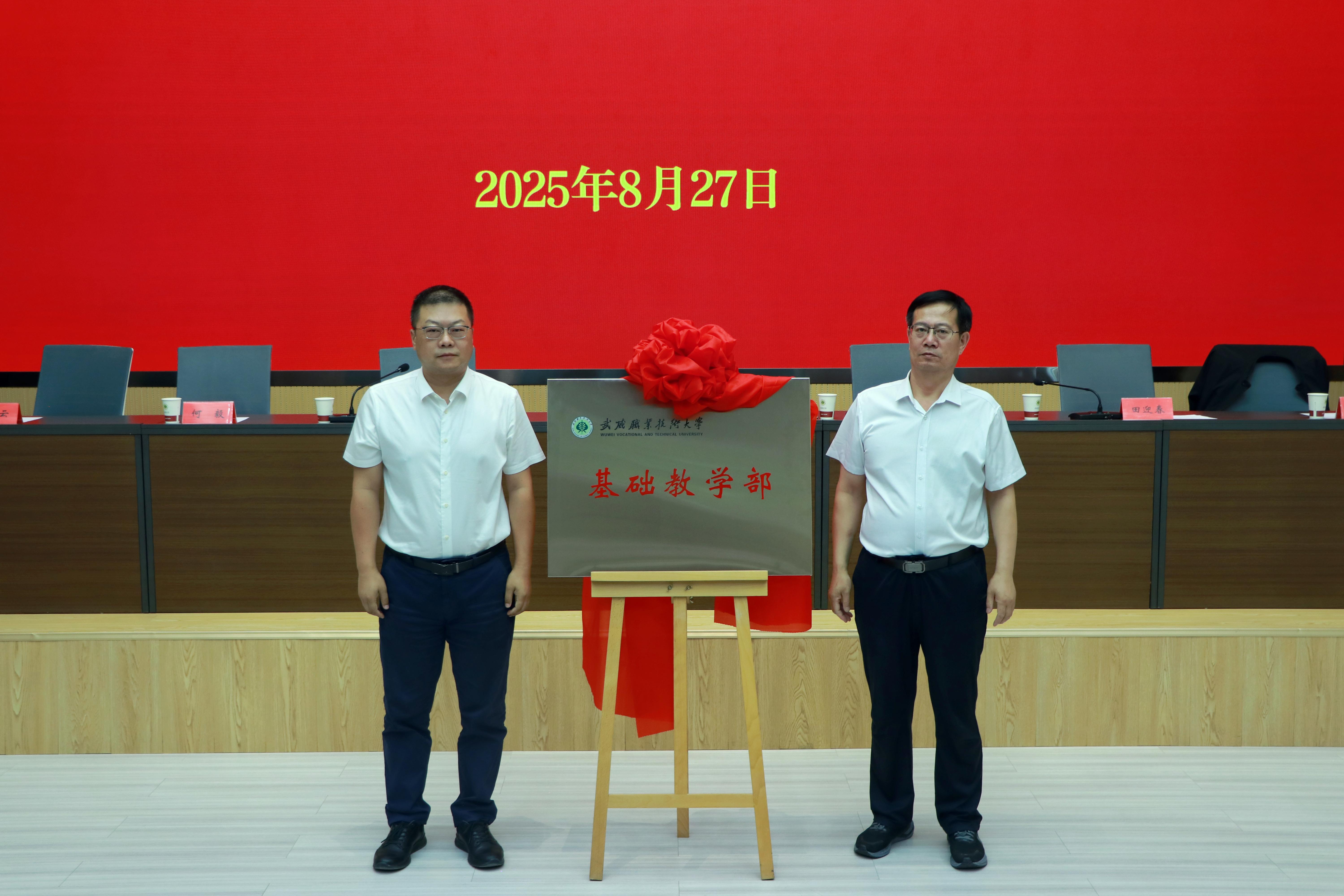 在全场热烈的掌声中,李海军与张开礼共同为“基础教学部”揭牌,标志着武威职业技术大学基础教学部正式组建成立。