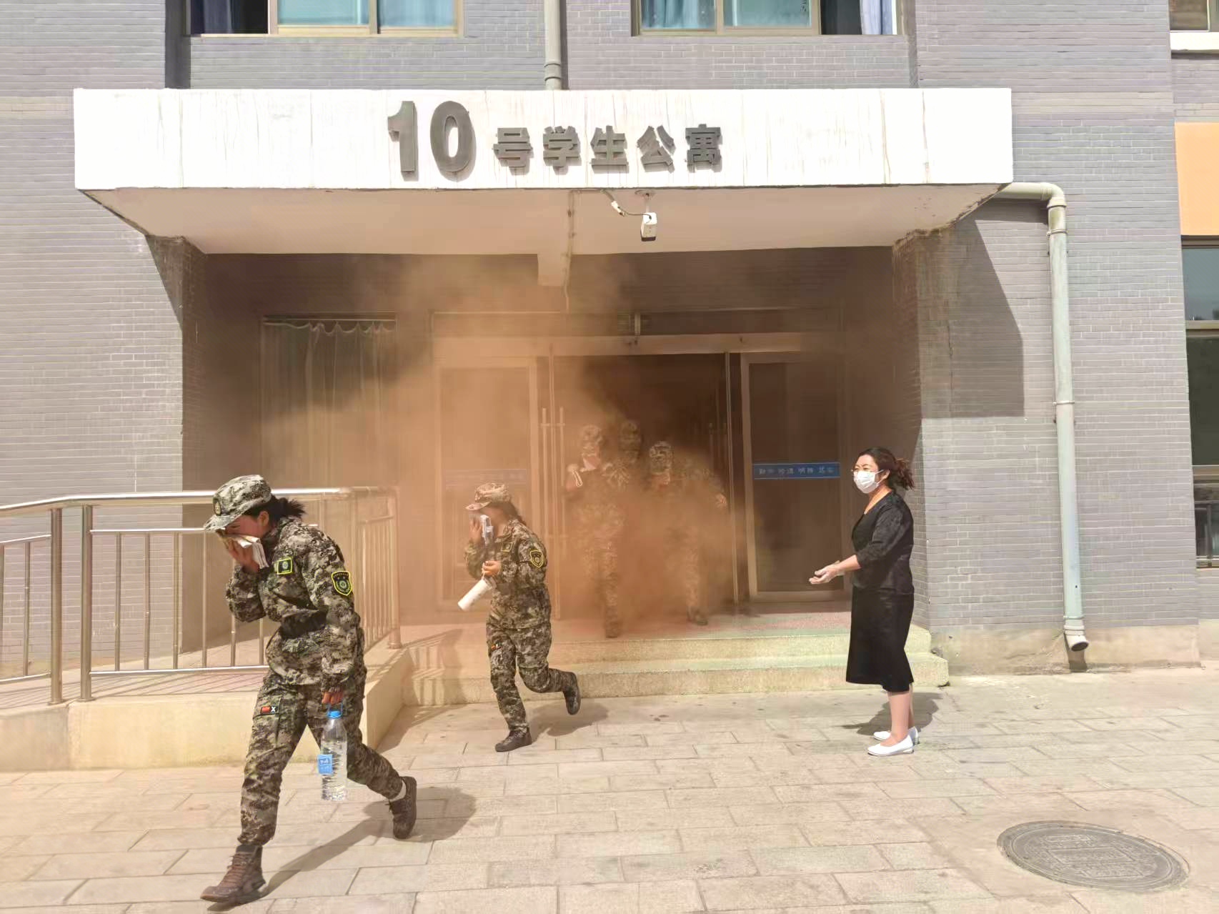 14时30分,疏散演练正式开始。随着火灾警报响起,安全保卫工作人员点燃烟饼,在学生公寓楼模拟火灾现场,冒出滚滚浓烟,公寓管理人员迅速组织学生有序疏散。在辅导员、班主任的引导下,同学们按照疏散要领和疏散路线,快速、有序地撤离至体育场。