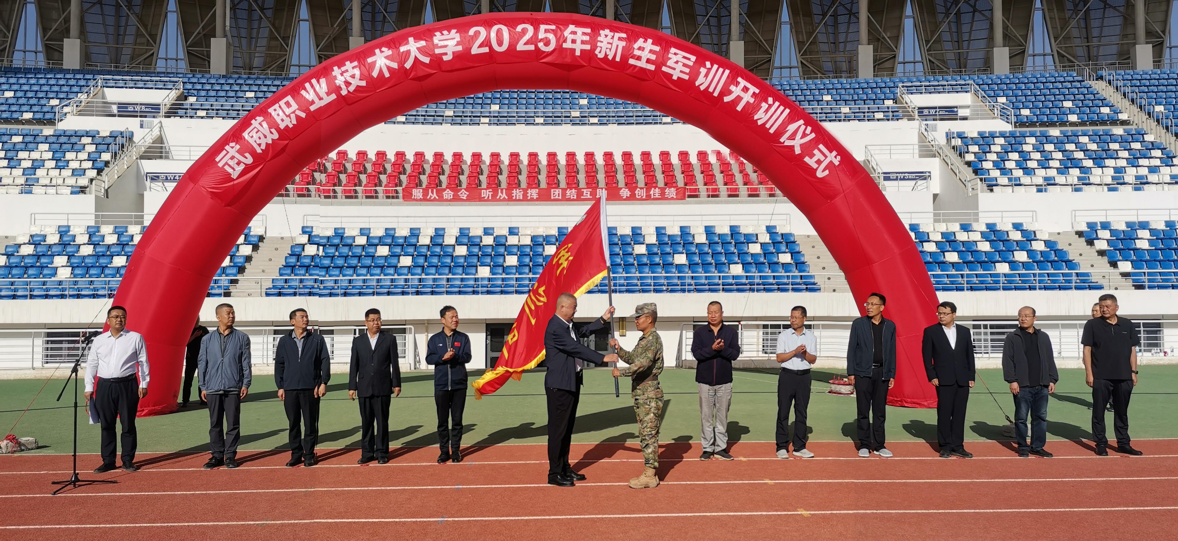 仪式最后,王守云代表学校向军训团授旗,并宣布“武威职业技术大学2025级新生军训开训”,2025级新生军训正式拉开序幕。