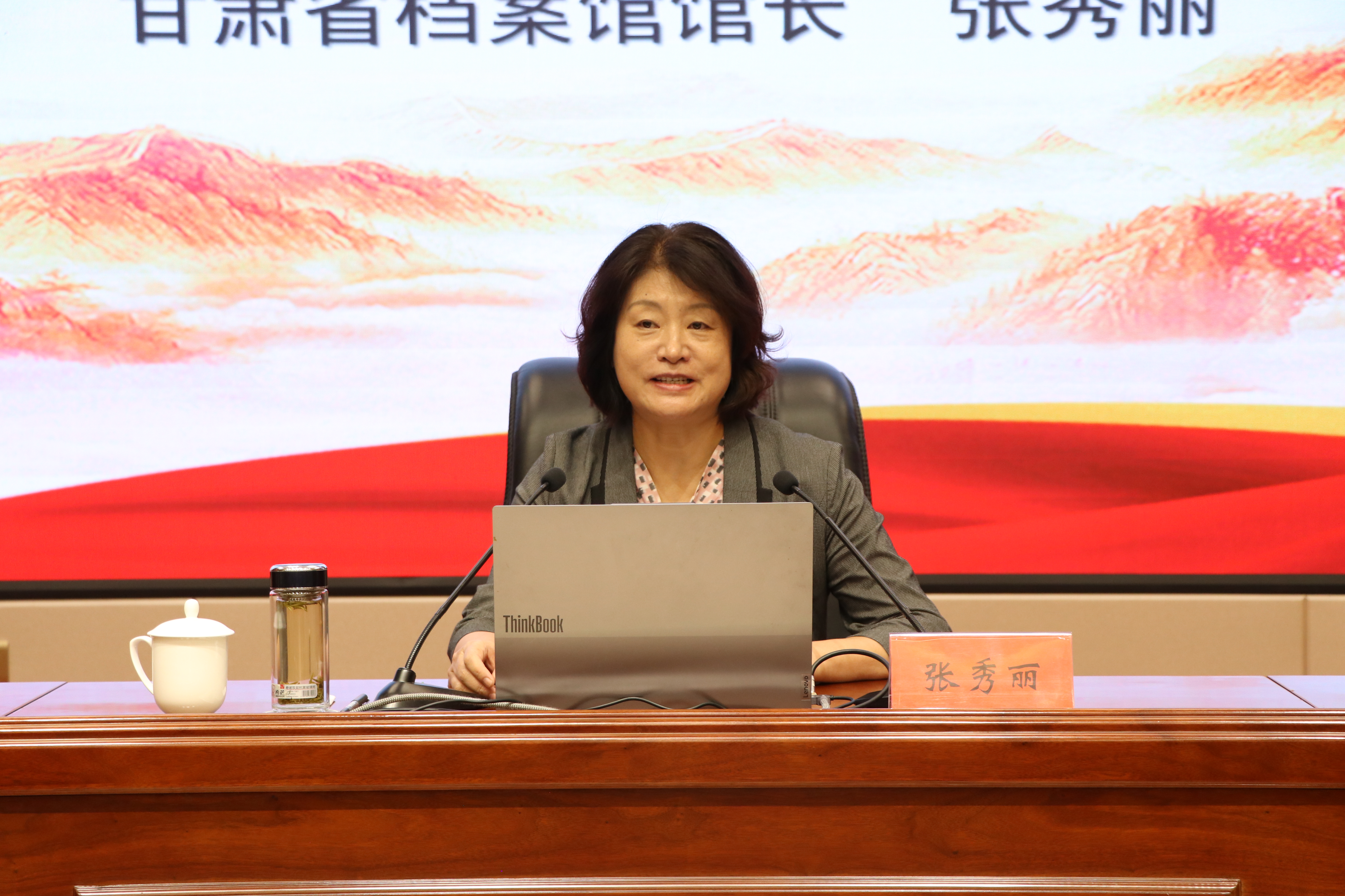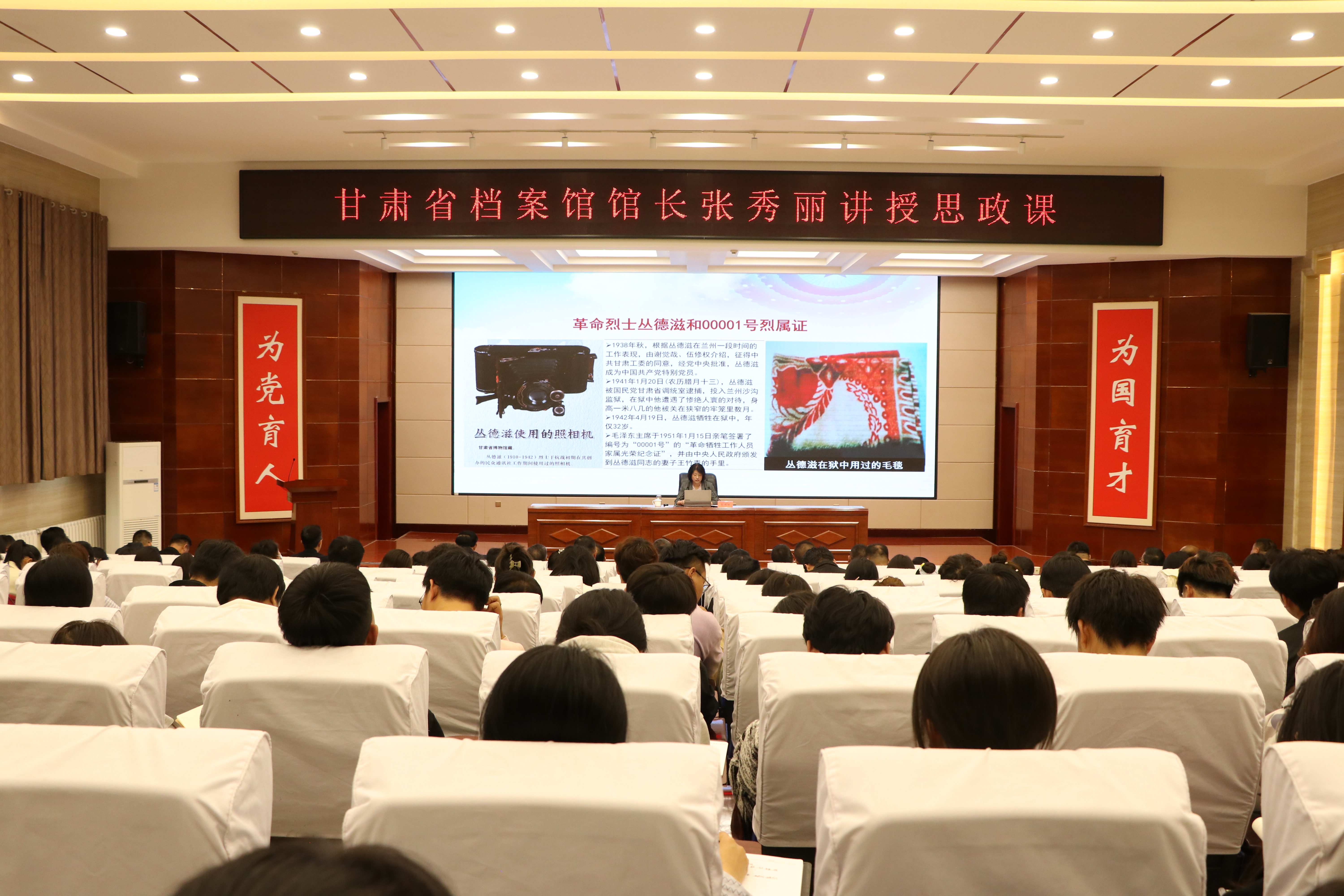 张秀丽结合自身从事档案管理和文化研究的丰富经验,从档案“存史、资政、育人”根本任务出发,通过大量珍贵档案文献和历史案例,系统阐述了档案在记录民族苦难辉煌、服务当代治国理政、培育时代新人中的重要作用。报告中,她以馆藏汉代简牍、革命烈士丛德滋00001号烈属证、民勤治沙档案、甘肃地震档案等一批具有历史代表性和地域特色的档案为载体,带领师生穿越时空,感受中华民族生生不息的精神力量,深刻解读“勿忘昨天的苦难辉煌,无愧今天的使命担当,不负明天的伟大梦想”的时代内涵。