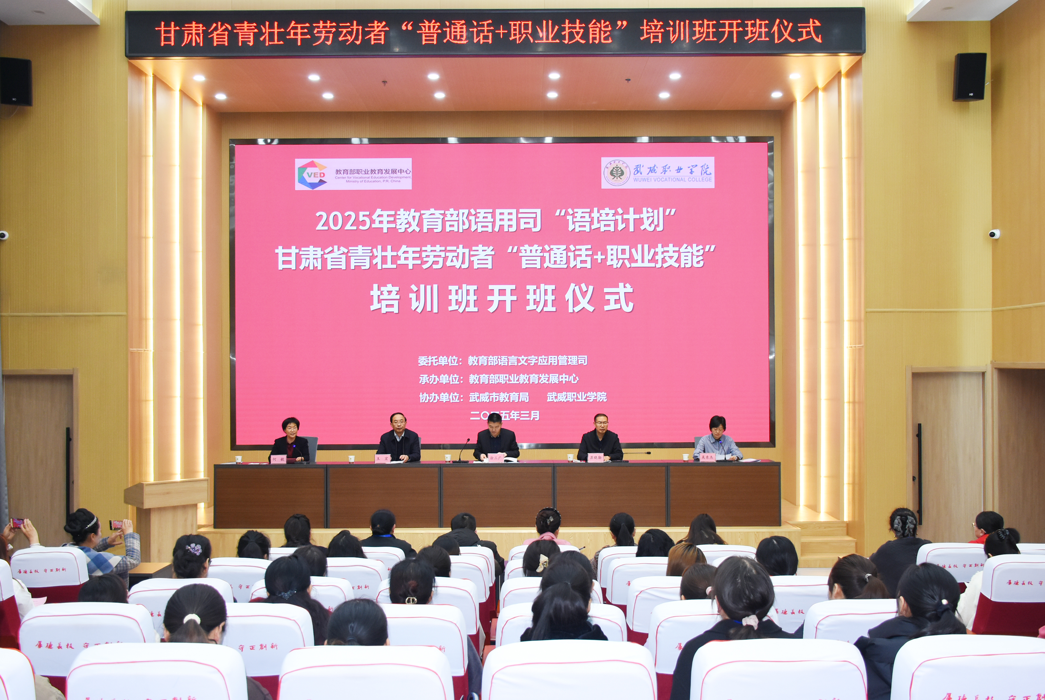 3月25日,教育部语用司“语培计划”甘肃省青壮年劳动者“普通话+职业技能”培训班在学校成功开班。本次培训由教育部语用司主办,教育部职业教育发展中心承办,武威市教育局和学校协办。本次培训是深入贯彻落实党的二十大和二十届二中、三中全会精神,落实全国教育大会精神,实施《教育强国建设规划纲要(2024-2035年)》的重要举措,旨在进一步推广国家通用语言文字的应用,促进铸牢中华民族共同体意识。