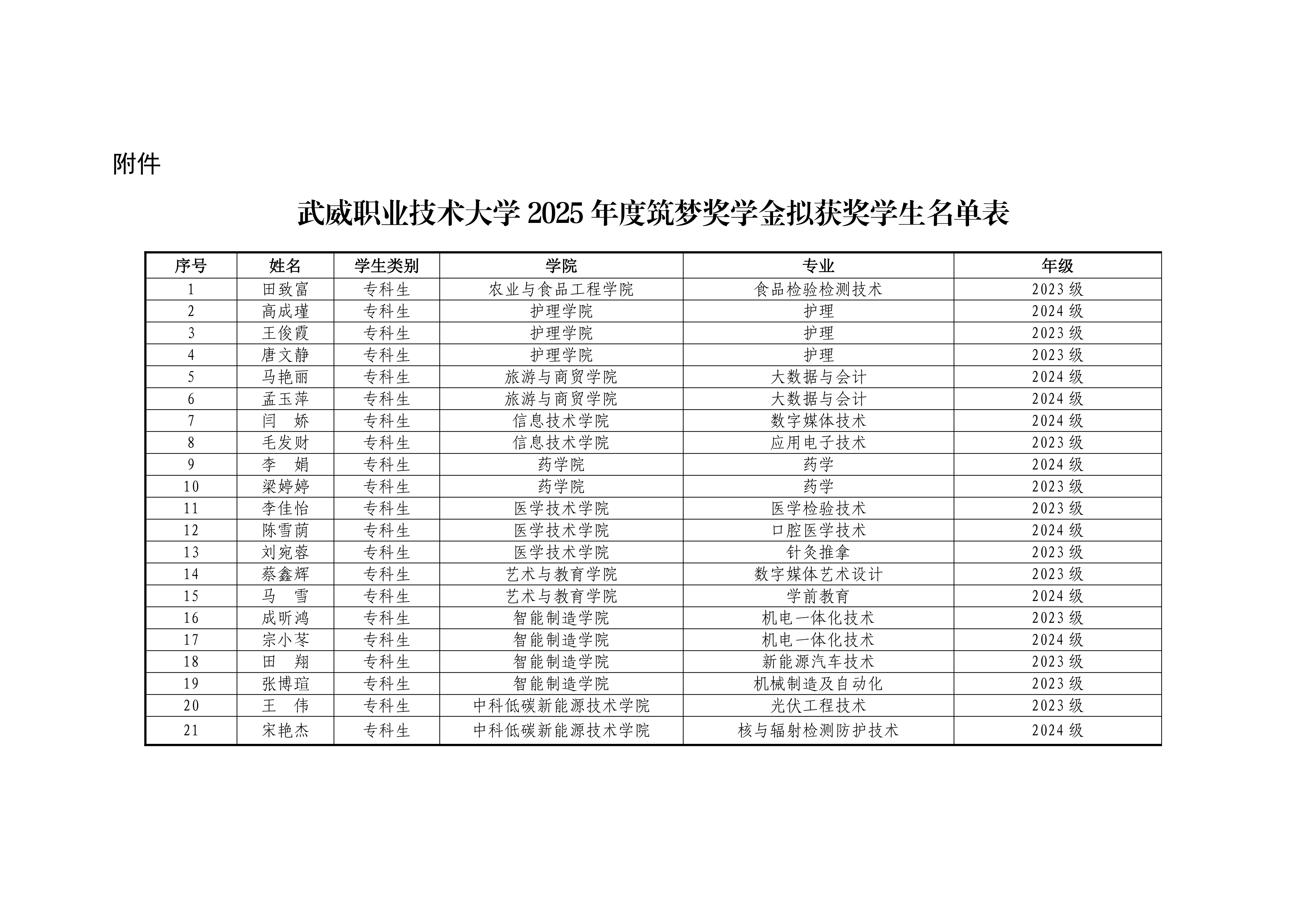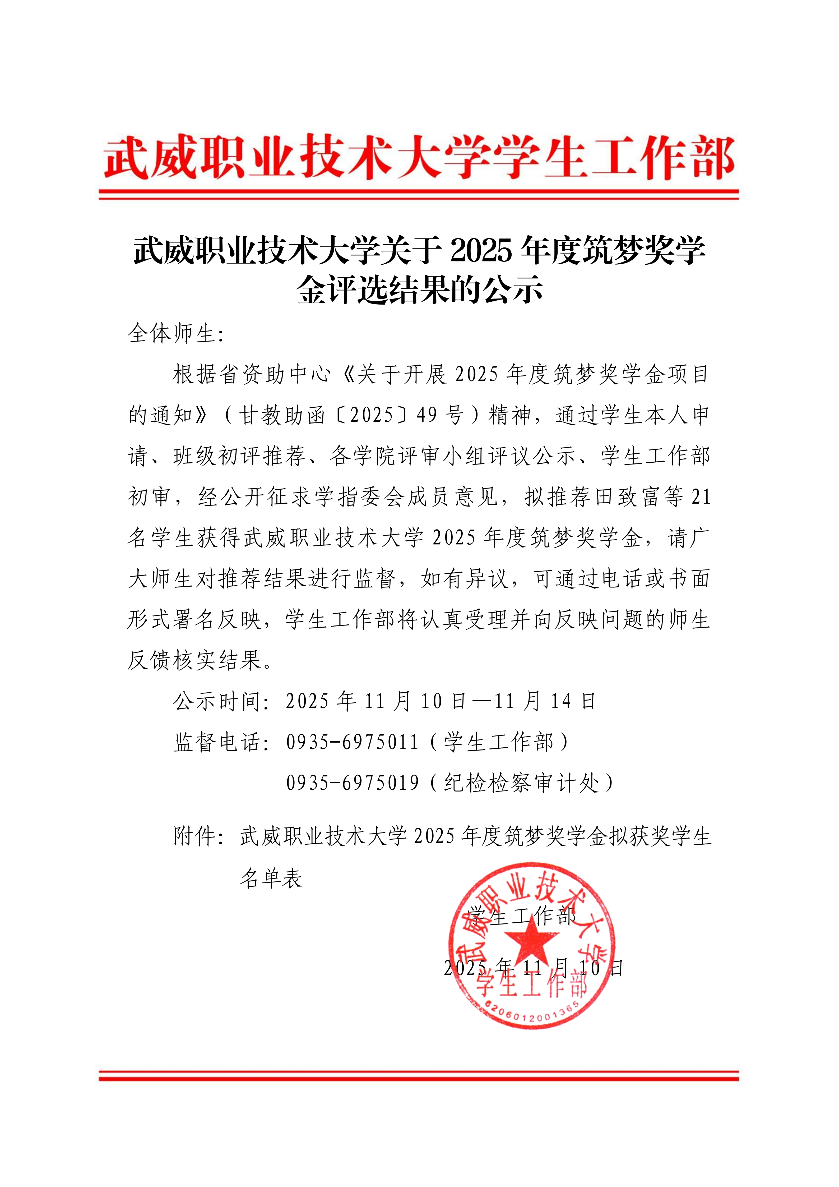 武威职业技术大学关于2025年度筑梦奖学金评选结果的公示