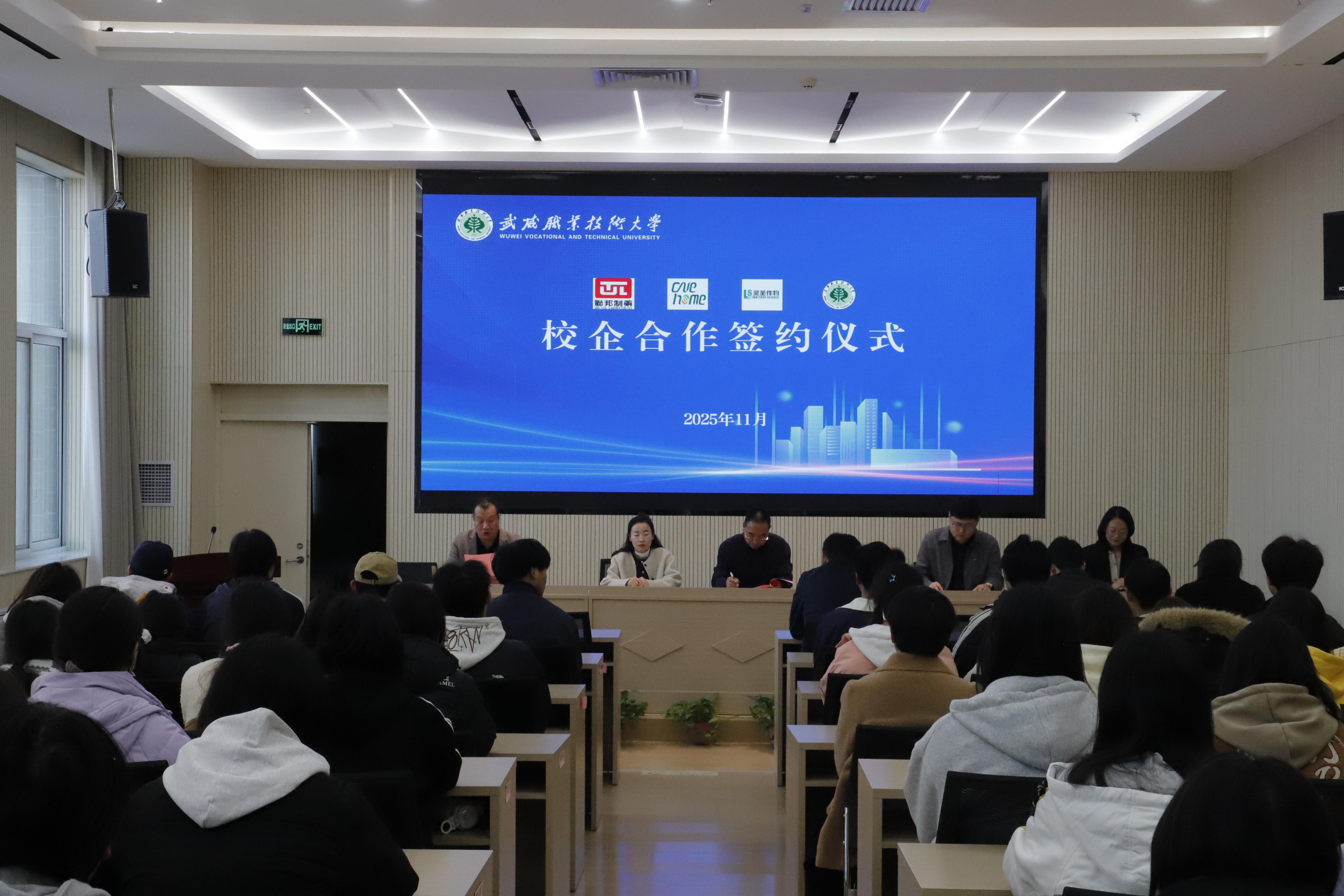 11月12日,药学院在图书馆报告厅举行校企合作签约暨授牌仪,内蒙古灵圣作物科技有限公司、联邦制药(内蒙古)有限公司和陕西顺意延成商贸有限公司负责人出席仪式,药学院师生代表90人参加仪式。