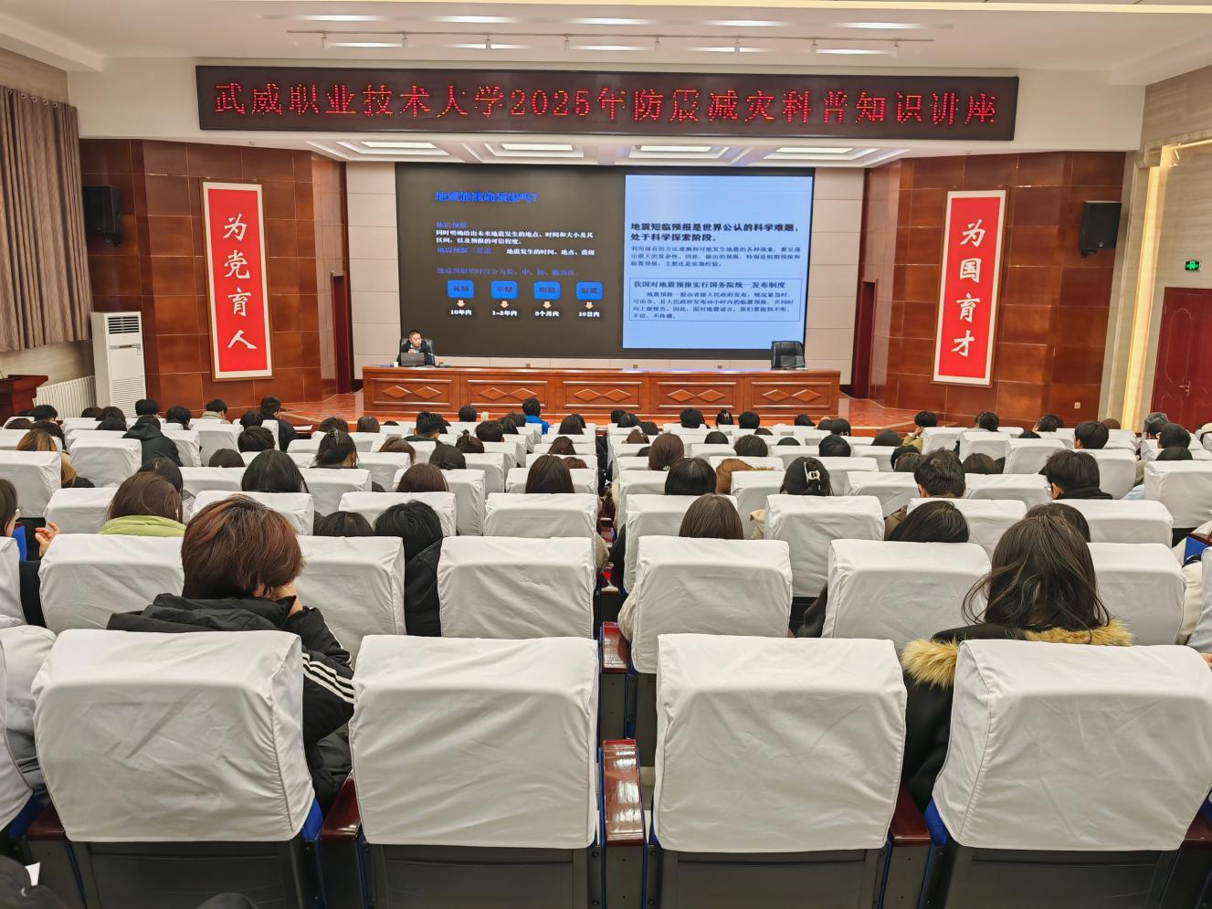 为进一步强化师生风险防范意识,切实提升校园防震减灾工作水平,11月26日,学校邀请武威市地震局防震减灾领域专家曹永鹏为师生开展防震减灾专题科普讲座,各学院辅导员、学生干部代表共220人在菁英厅参加活动。