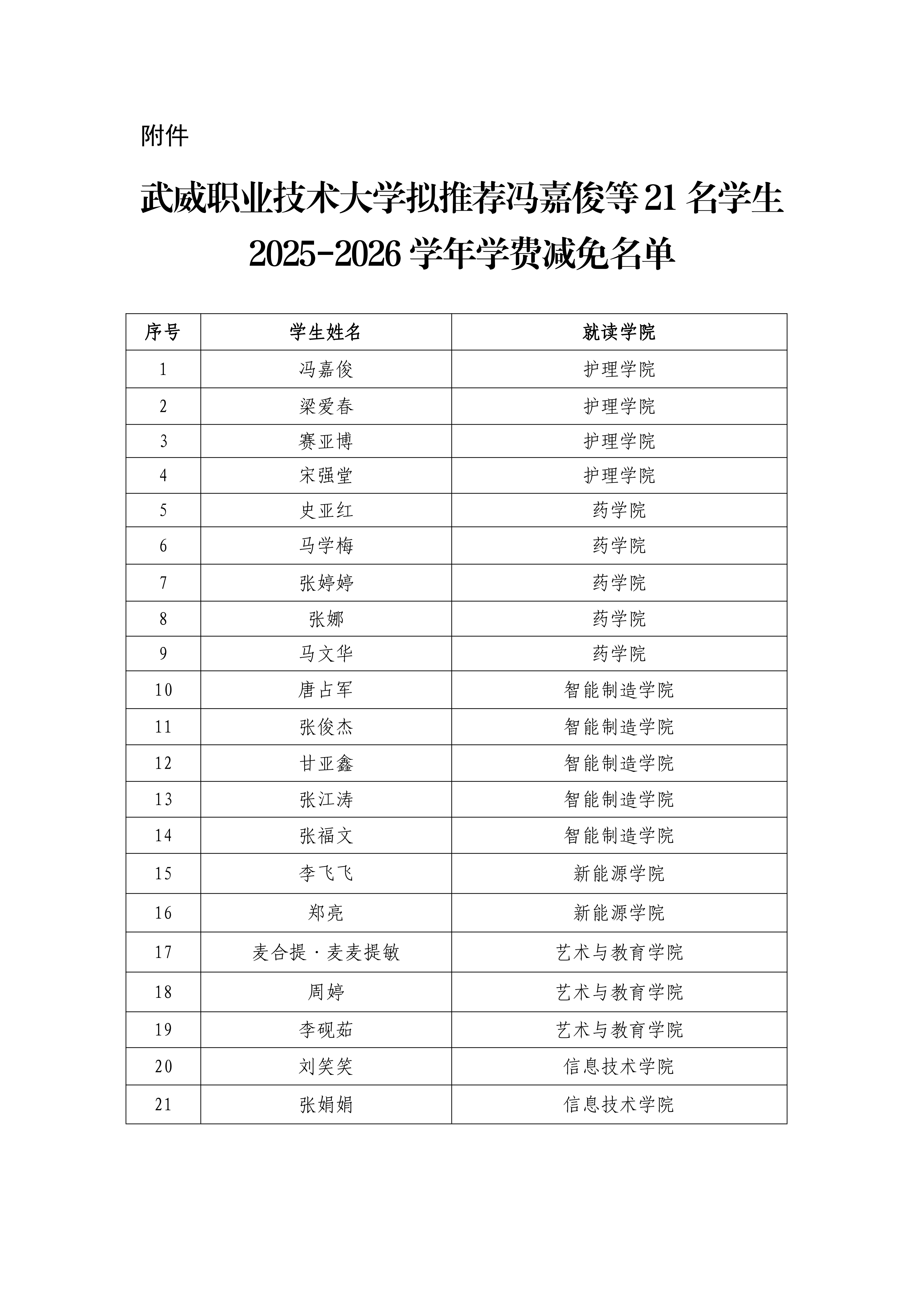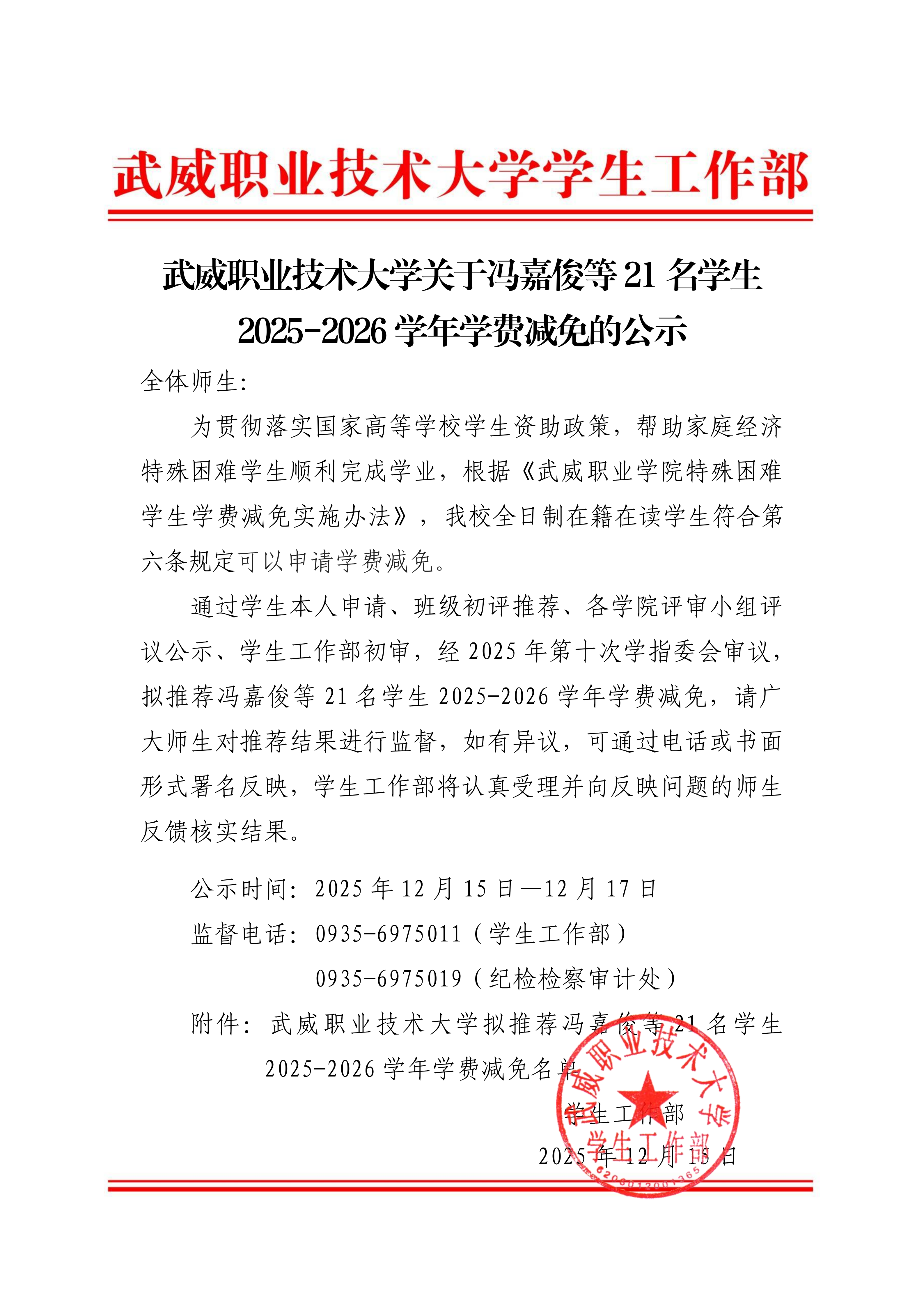 武威职业技术大学关于冯嘉俊等21名学生2025-2026学年学费减免的公示