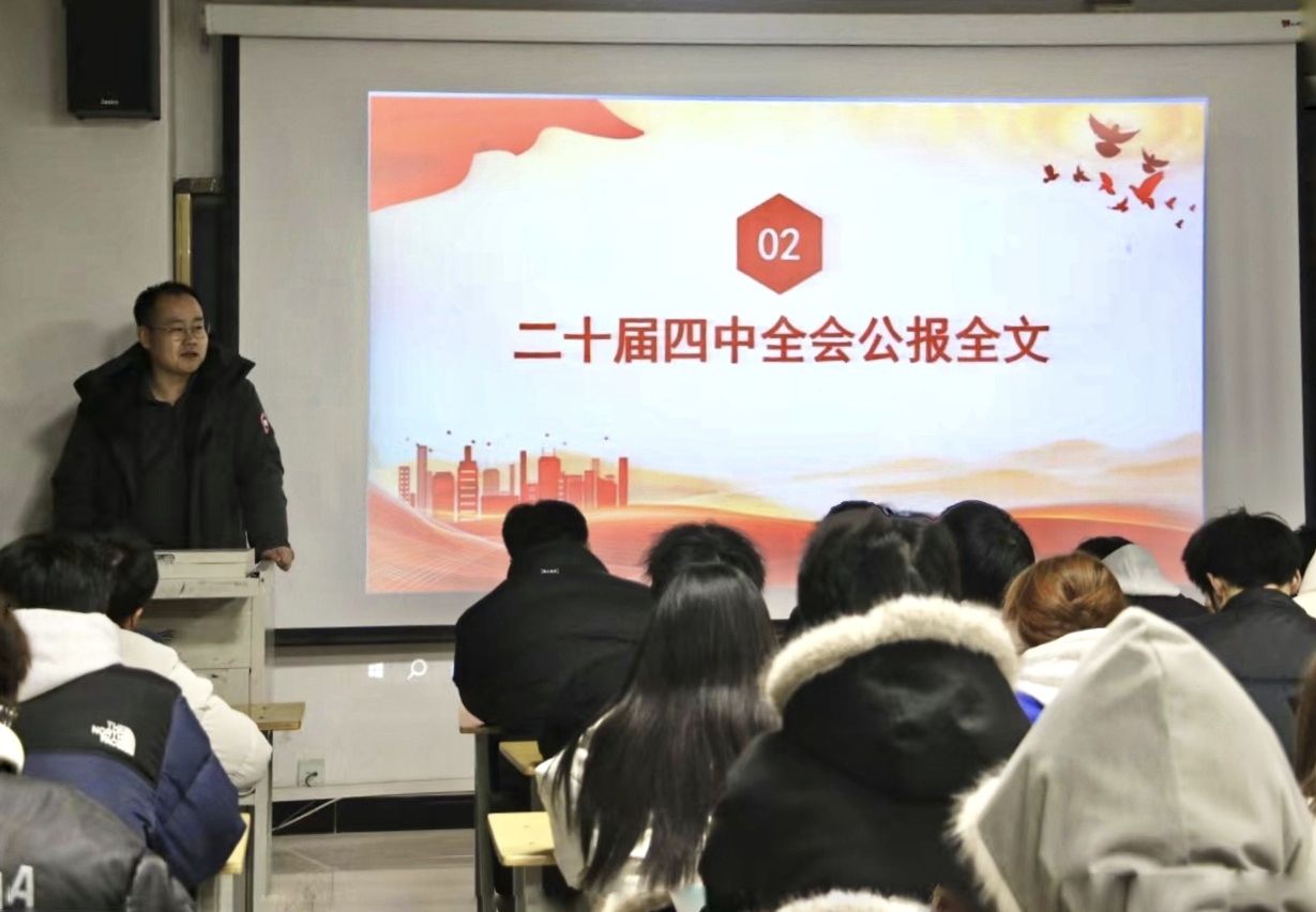 12月5日,学院党总支书记黄述杰率先开展专题培训,围绕党的二十届四中全会召开的时代背景、重大意义和核心要义进行系统解读,全体党员及入党积极分子参会学习。黄述杰强调,要持续深化党的创新理论武装,将学习贯彻党的二十届四中全会精神与学习贯彻习近平新时代中国特色社会主义思想紧密结合,切实把学习成果转化为推动工作的实际成效;要纵深推进“四个突出”战略发展思路,紧扣铸牢中华民族共同体意识主线,锚定“十个较强”发展目标,推动“铸牢”工作全面融入专业建设、教书育人全过程各方面;要聚焦教育教学主责主业,持续深化“大学风”建设与课程思政改革,着力在抓落实、抓基层、抓学风上实现新突破、取得新成效。