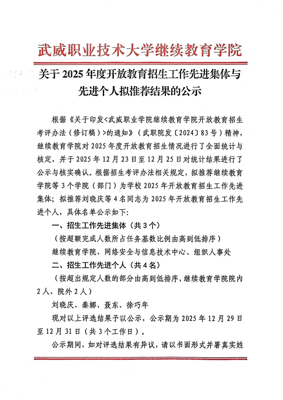 关于2025年度开放教育招生工作先进集体与先进个人拟推荐结果的公示