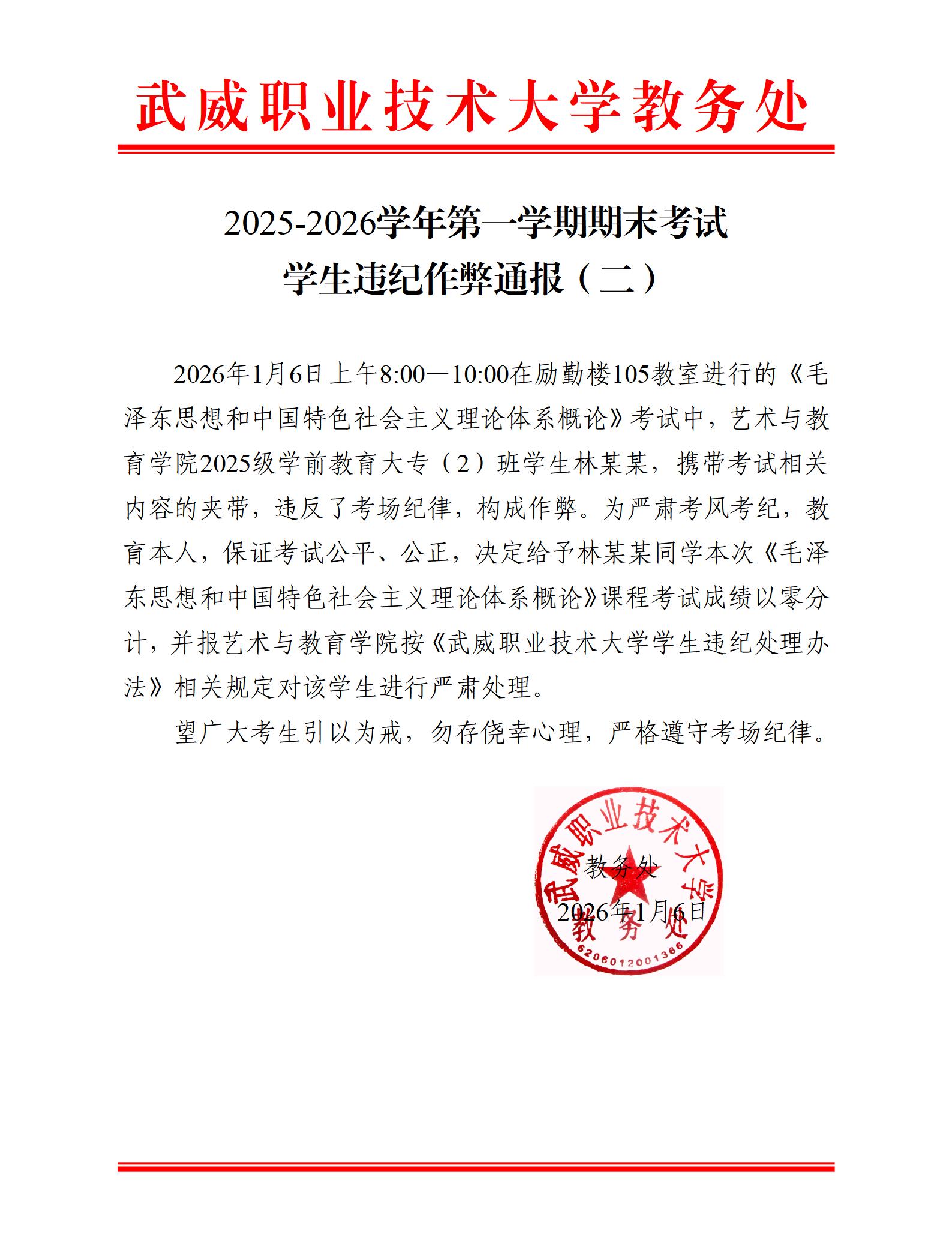 2025-2026学年第一学期期末考试学生违纪作弊通报(二)