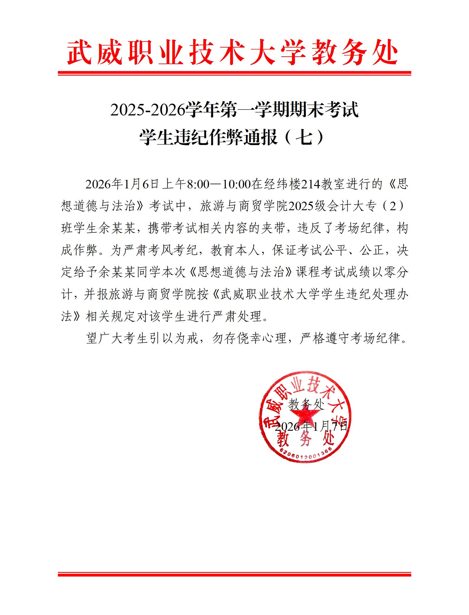 2025-2026学年第一学期期末考试学生违纪作弊通报(七)