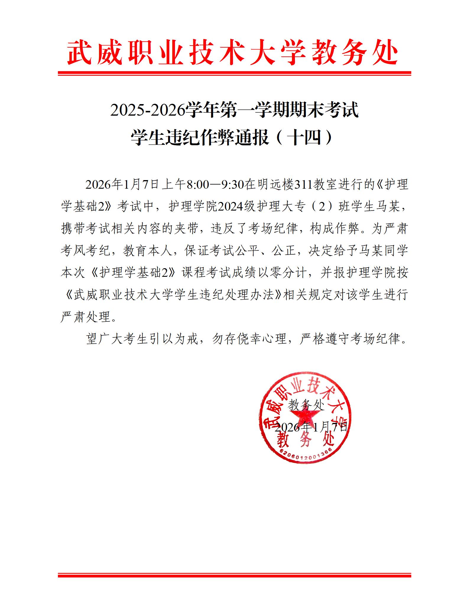 2025-2026学年第一学期期末考试学生违纪作弊通报(十四)