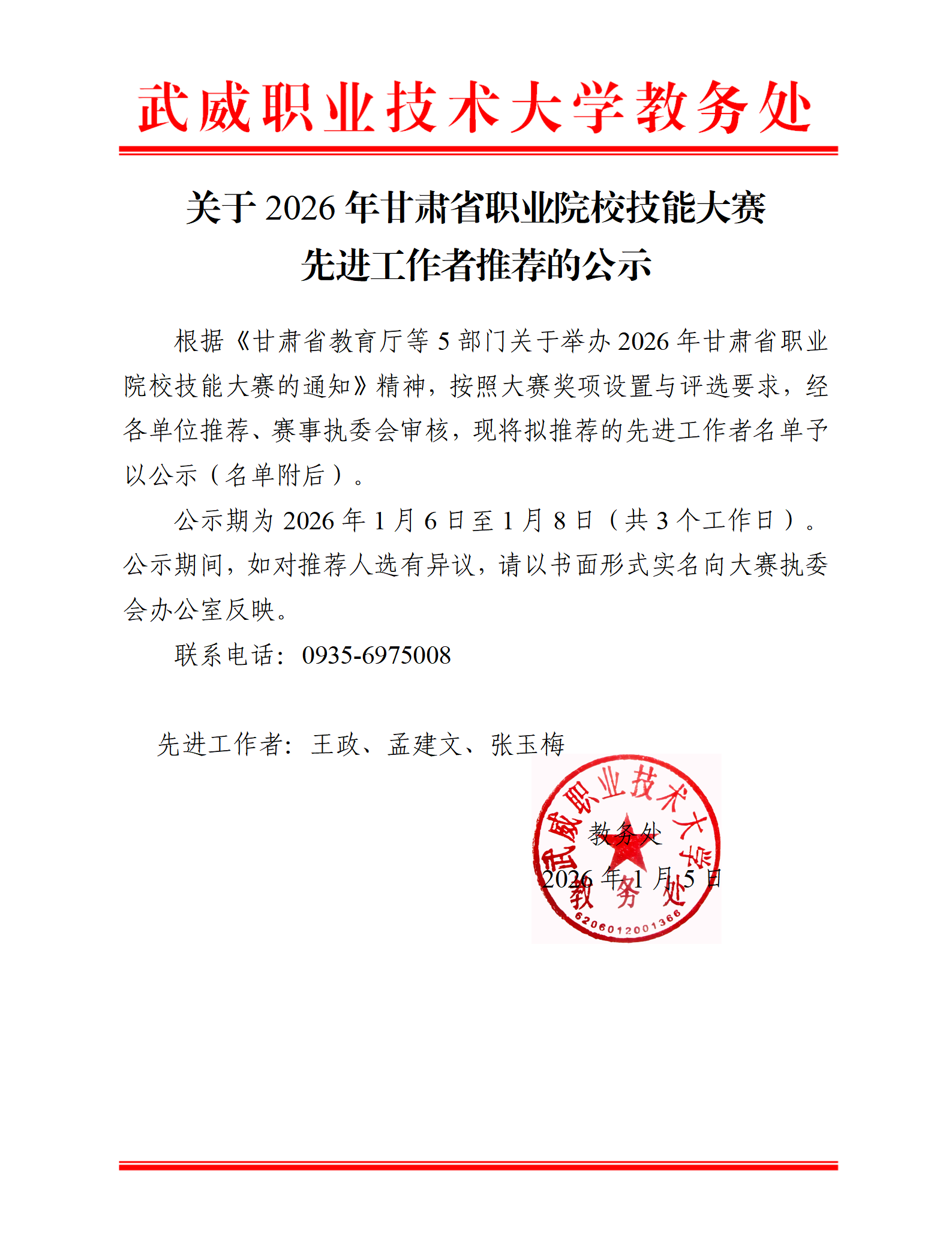 关于2026年甘肃省职业院校技能大赛先进工作者推荐的公示