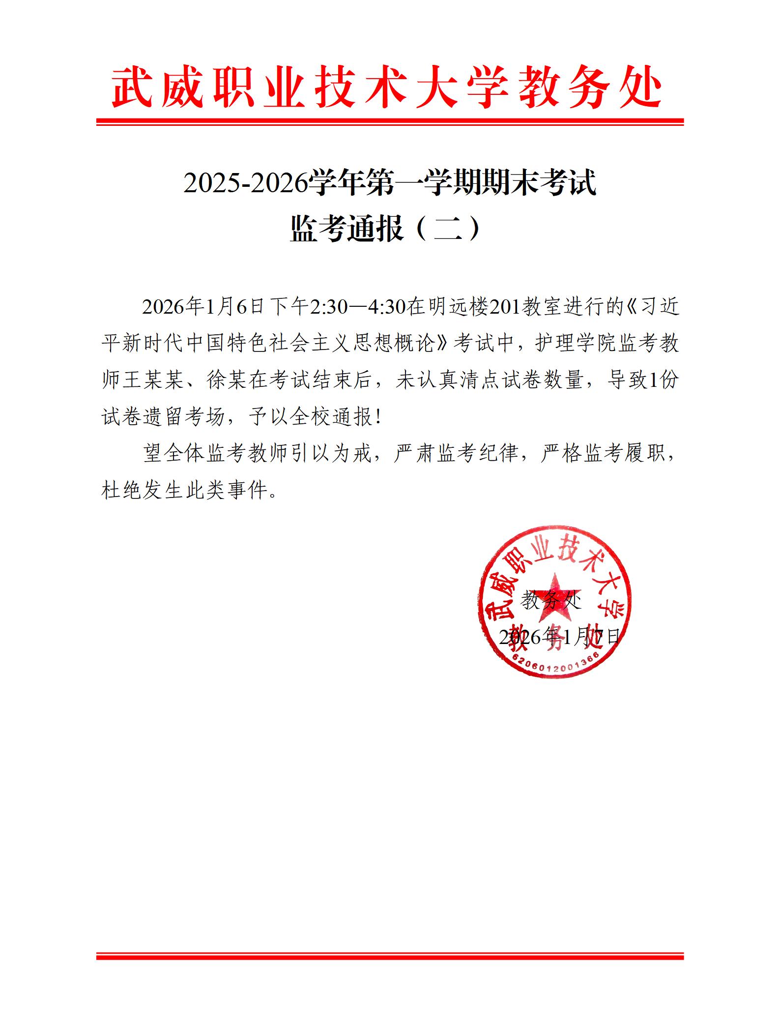 2025-2026学年第一学期期末考试监考通报(二)