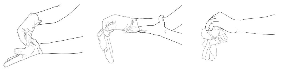 2.戴着手套的手握住脱下的手套,用脱下手套的手捏住另一只手套清洁面(内面)的边缘,将手套脱下;