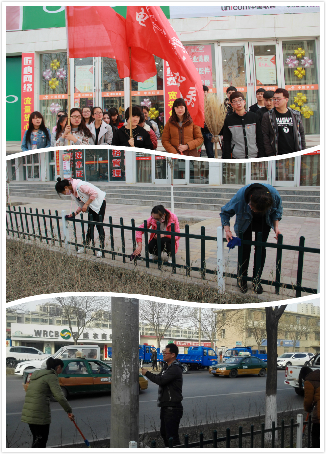 电子信息工程系团总支结合团市委、院团委《关于开展城乡环境卫生整治青年志愿服务活动的通知》安排,3月3日下午16:30组织20名团员青年在学院北门口道路两侧开展了卫生死角清扫,栅栏清洁,果皮箱清洁,公交站台清洁,小广告清理,垃圾清运。学生志愿者尽己所能,服务社会,传播劳动信念,为建设美好社会贡献自己的一份微薄力量。
