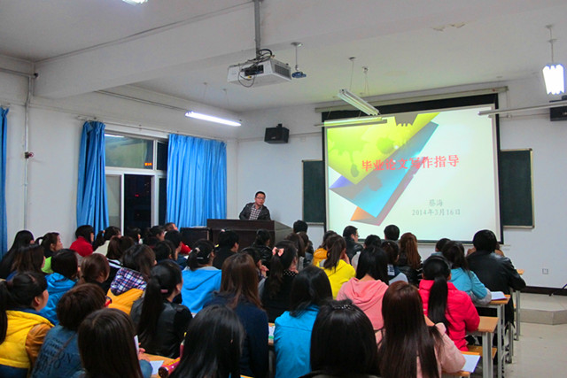 系主任晏素珍对本次毕业生毕业论文(设计)做了三点要求,一是全体毕业生要高度重视毕业论文(设计)的写作;二是严格按照指导教师的要求保质保量的完成论文;三是每位指导老师对论文指导工作要认真负责、耐心细致。蔡海老师做了题为《毕业生论文写作指导》的报告,主要从论文格式要求、文献查询方法、论文写作方法三个方面给同学们做了深入浅出的讲解,受到同学们的热烈欢迎。