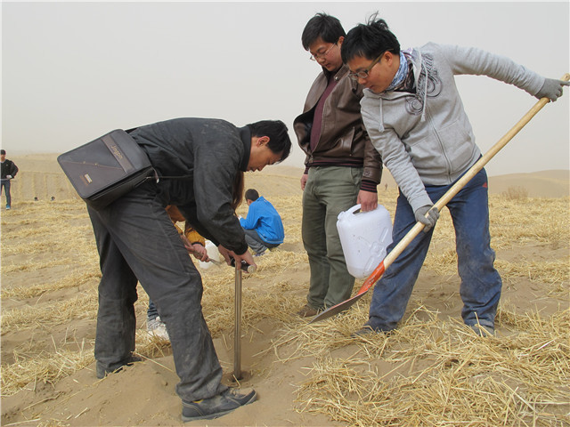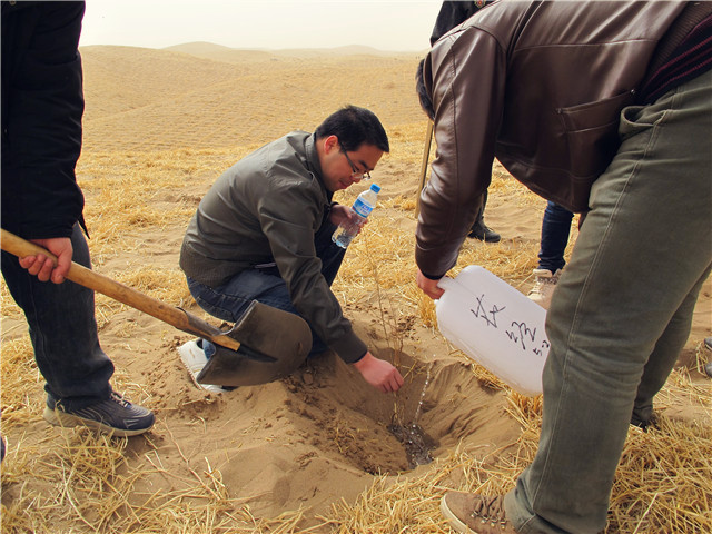 到达治沙造林现场后,师生按照划分好的区域,带上塑料桶,拿上土钻,马上投入到了紧张的劳动中。在现场技术人员的指导下挖坑、栽种树苗、浇水,完成了预定的治沙造林任务。