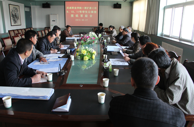 2013年3月27日上午,在二号教学楼会议室召开9、10、11号学生公寓楼图纸答疑会。设计单位清华大学建筑设计研究院,施工投标单位甘肃省第三建筑公司,甘肃省第四建筑公司,武威高坝建筑公司以及学院相关人员参加了会议。会议由副院长赵明主持。