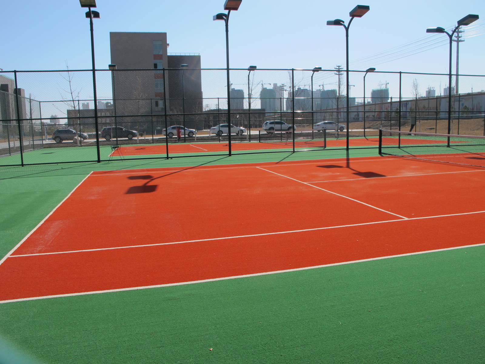 学院网球场采用标准尺寸设计,包括两个标准场地。外铺设彩色散水砖,内铺设人工草坪和塑胶场。其中每个网球场南北长36.6米,东西宽18.3米。施工包括弹性球场基础工程,弹性球场面层工程,网球场围网、拦网及网球场照明工程组成。