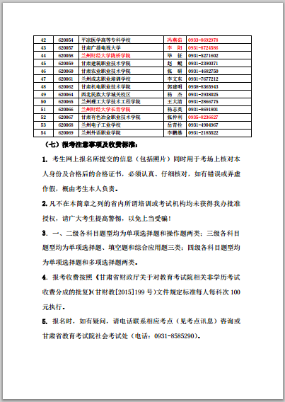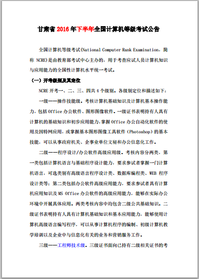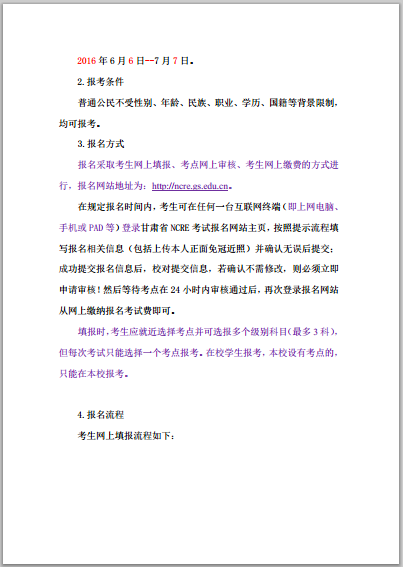 5.详细信息请参看甘肃省教育考试院《关于做好2016年9月全国计算机等级考试网上报名工作的通知》(甘教考院〔2016〕95号文件)及《甘肃省2016下半年全国计算机等级考试公告》(已传至群文件)。