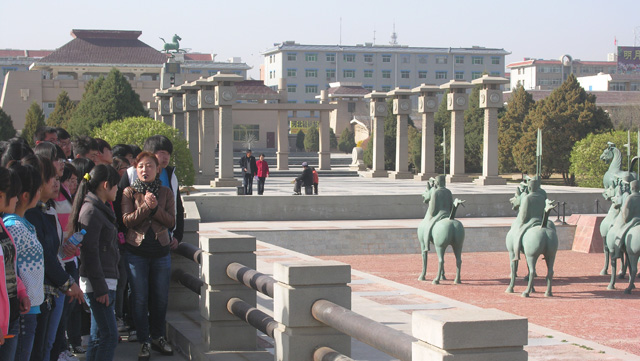 同学们在讲解员的带领下,首先从汉风格大门"中华第一门"开始、参观了天下第一马"马踏飞燕"、凝聚汉文化精粹的巨型浮雕、牌楼、图腾柱以及堪称"世界之最"的整体放大6倍的99件铜车马仪仗俑队列,最后参观了雷台汉文化陈列馆.