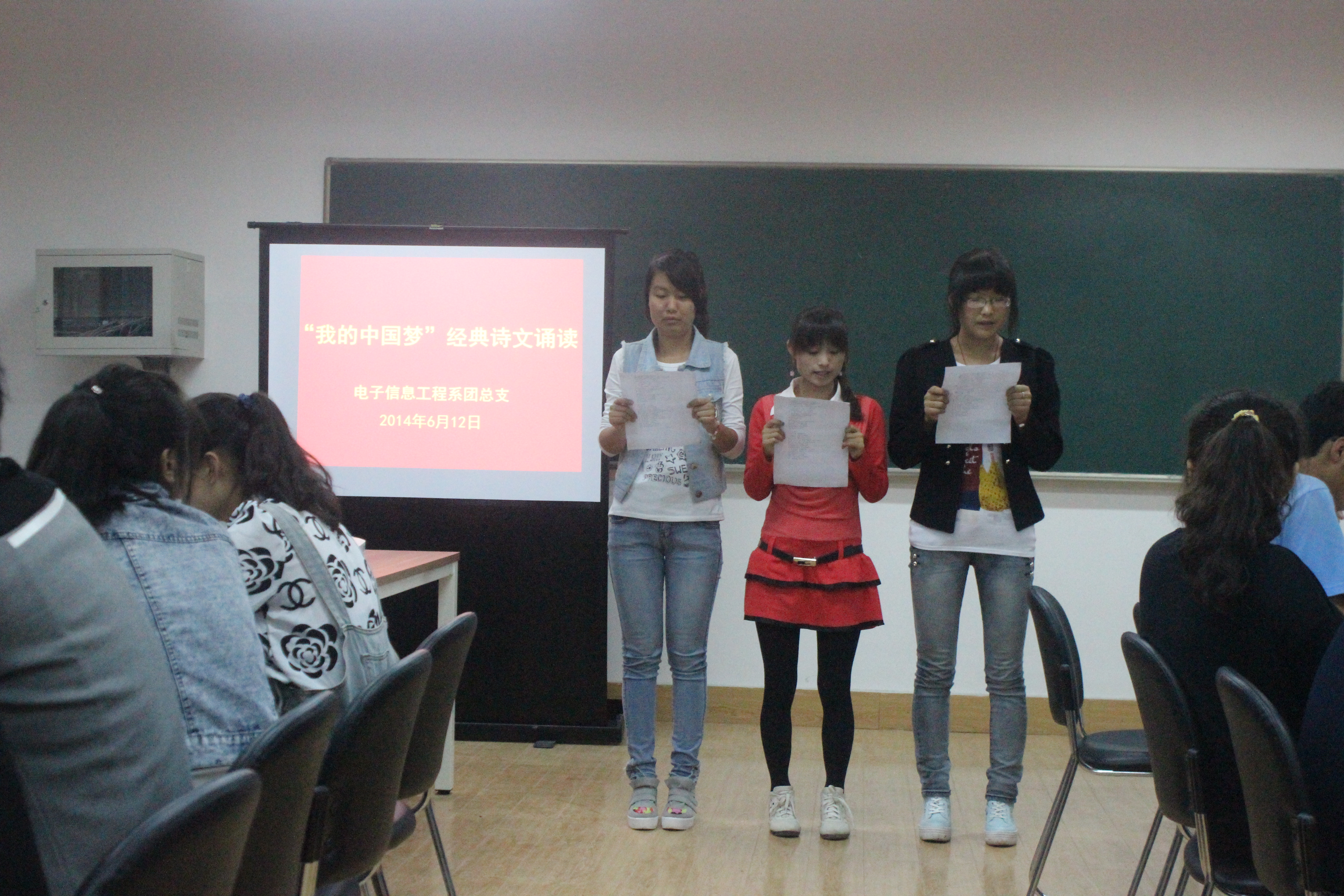 为进一步培育和弘扬社会主义核心价值观,让学生在经典诵读中触摸中国传统文化,增强爱国主义情怀,提升学生的文化底蕴和人文素养,深入开展中国特色社会主义宣传教育,教育和引导大学生树立正确的理想信念,努力为实现国家富强、民族复兴、人民幸福的伟大“中国梦”而努力。电子信息工程系团总支于6月12日晚在MIDP移动互联网学院教研室举办“我的中国梦”经典爱国诗文诵读活动。