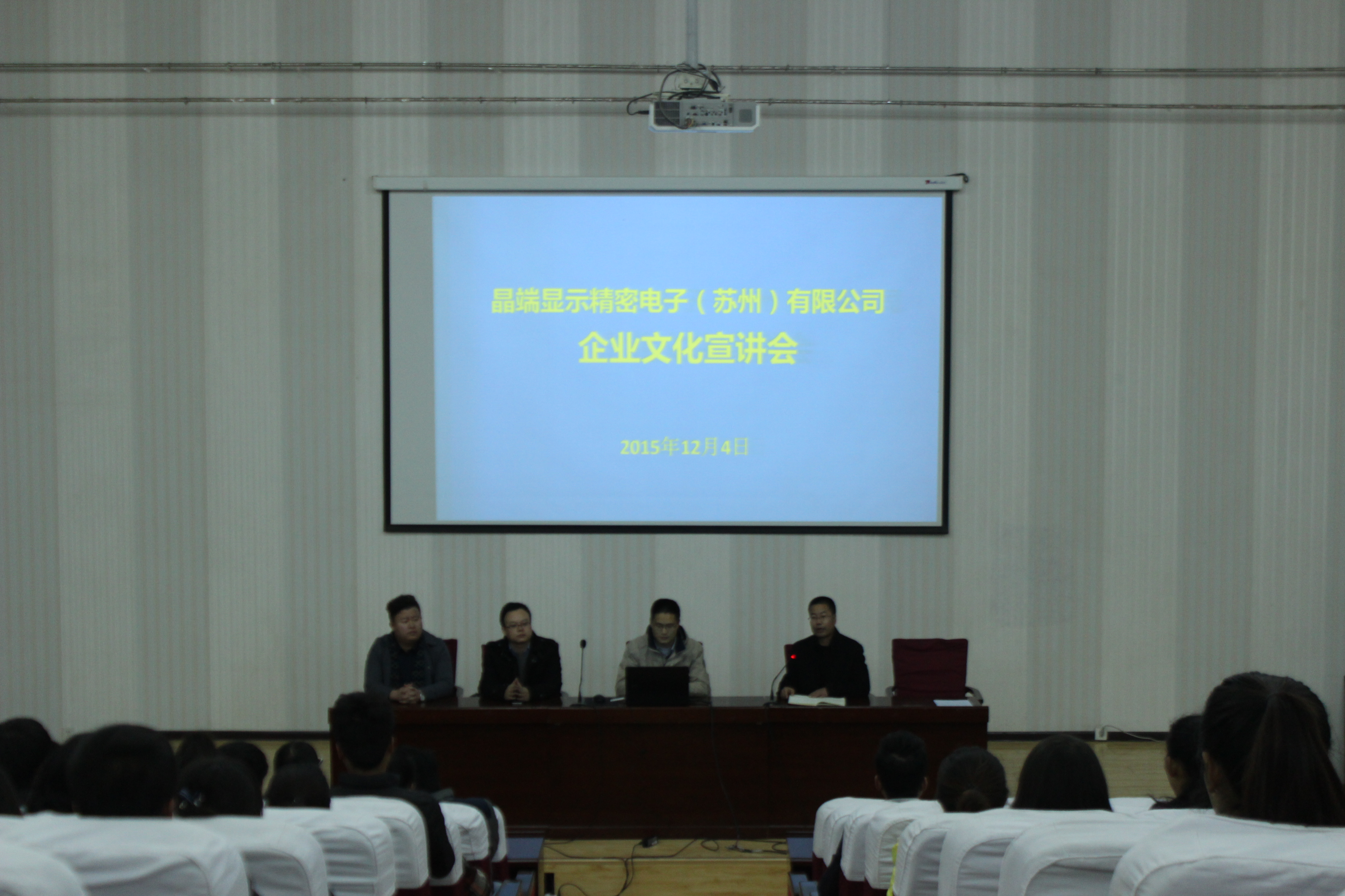 为切实做好2016届毕业生就业工作,加强学院同用人单位的广泛交流与合作,拓展就业渠道,培育就业市场,促使毕业班同学顺利实习、就业,12月4日下午4时,电子信息工程系在学院正德厅举办了用人单位宣讲招聘会。本次活动邀请了学院校企合作理事单位晶端显示精密电子(苏州)有限公司参加,电子类专业学生180多人参加了本次宣讲招聘会。
