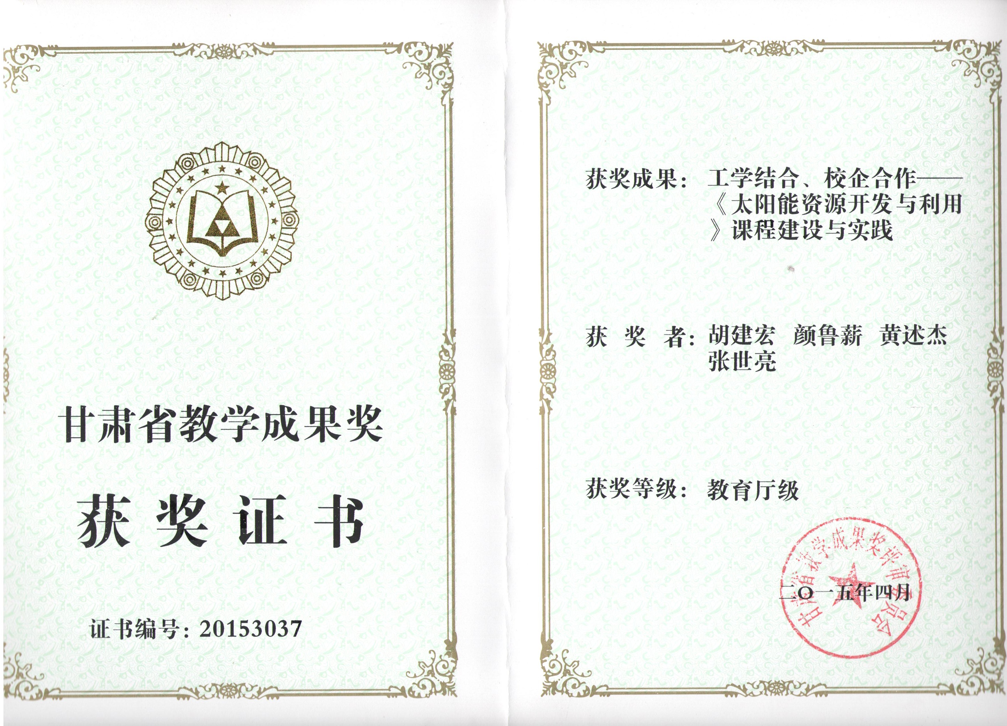 《太阳能资源开发与利用》课程建设与实践荣获甘肃省教学成果奖