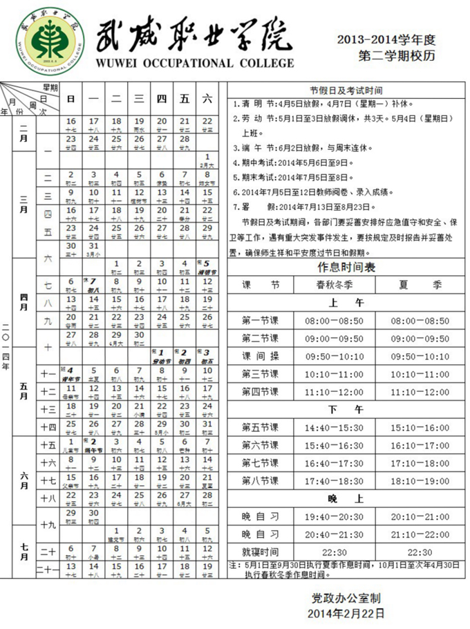 2013-2014学年度 第二学期校历