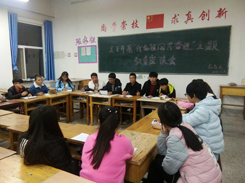 通过组织各班团干部开展 “我与祖国共奋进”主题座谈会,让团干部们对历史有了深刻的了解,也让同学们在这次座谈会中深刻领悟到身为中华儿女要勿忘耻辱,为实现中华民族伟大复兴的中国梦而勤奋学习。同时,各班团支部以形式多样的主题团会,表达出为了实现“中国梦”,让屈辱的历史不再重演,将要万分珍惜今天这来之不易的和平生活,努力学习,不断进取。