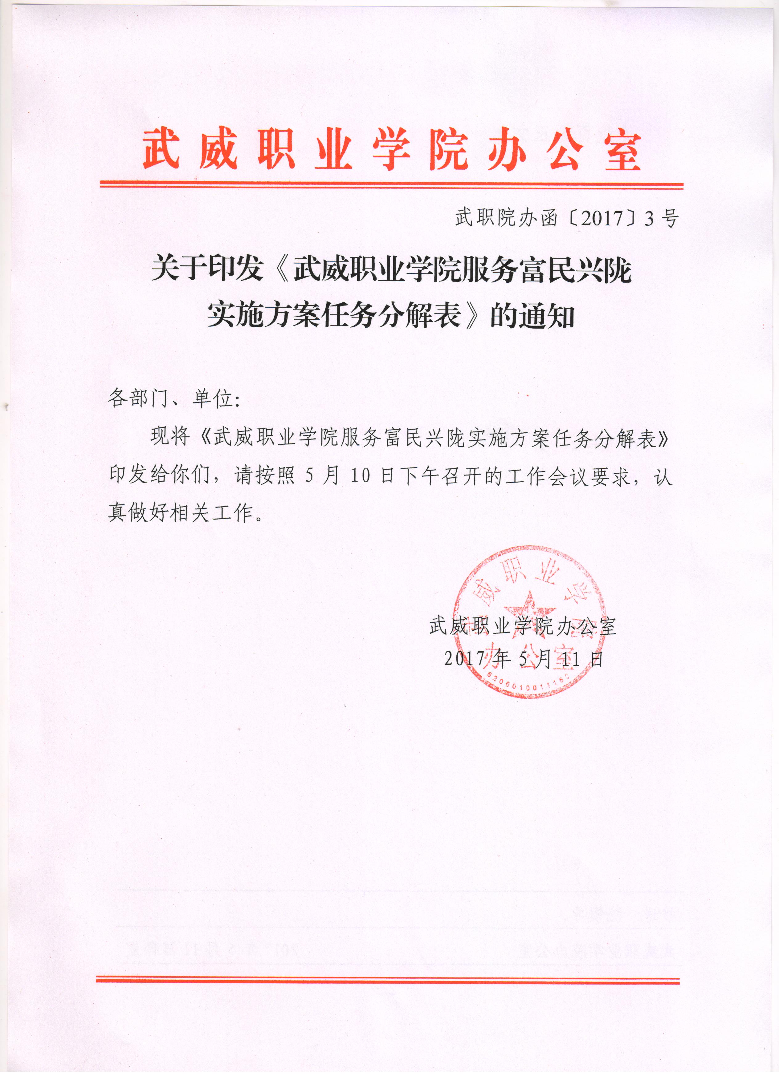 关于印发《武威职业学院服务富民兴陇实施方案任务分解表》的通知