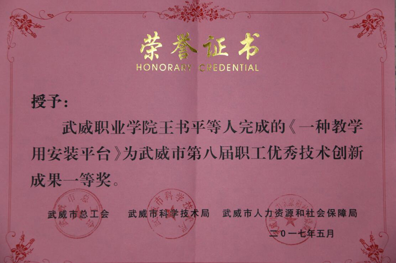 为贯彻落实武威市委、市政府关于《武威市十万职工职业技能素质提升活动工作方案(2016-2020年)》(武政办发〔2016〕72号)文件精神,推动我市“双创”工作的深入开展,激发我市广大企事业职工提升技能和开拓创新的热情。近日,由市总工会、市人社局、市科技局等单位联合举办了“武威市第八届职工技术创新成果评选活动”。本届职工技术创新成果评选共征集创新成果87项,其中:学院推荐了十项研究课题、专利技术项目,王书平团队《一种教学用安装平台》项目成果荣获一等奖,申宾德团队《简易焊工考试用带坡口钢板火焰切割下料机的研究与应用》,王胜团队《“胰美舒”治疗2型糖尿病周围神经病变(气阴两虚兼瘀证)的临床观察》项目成果荣获三等奖。