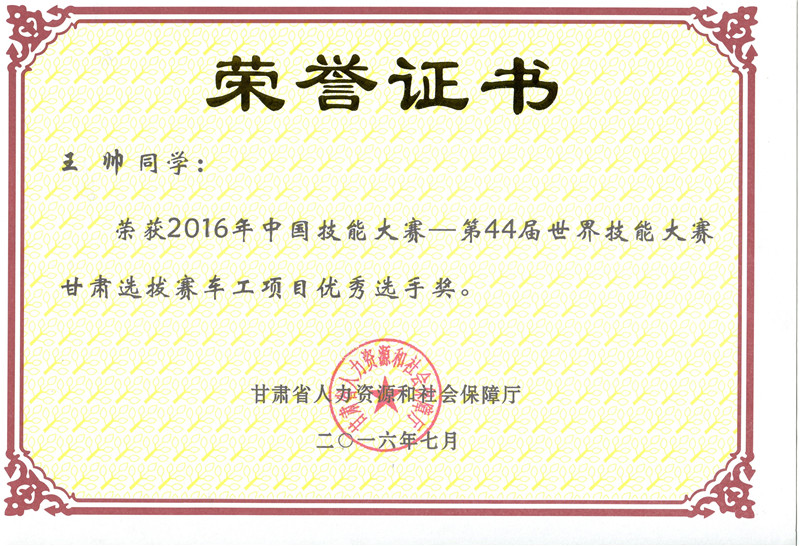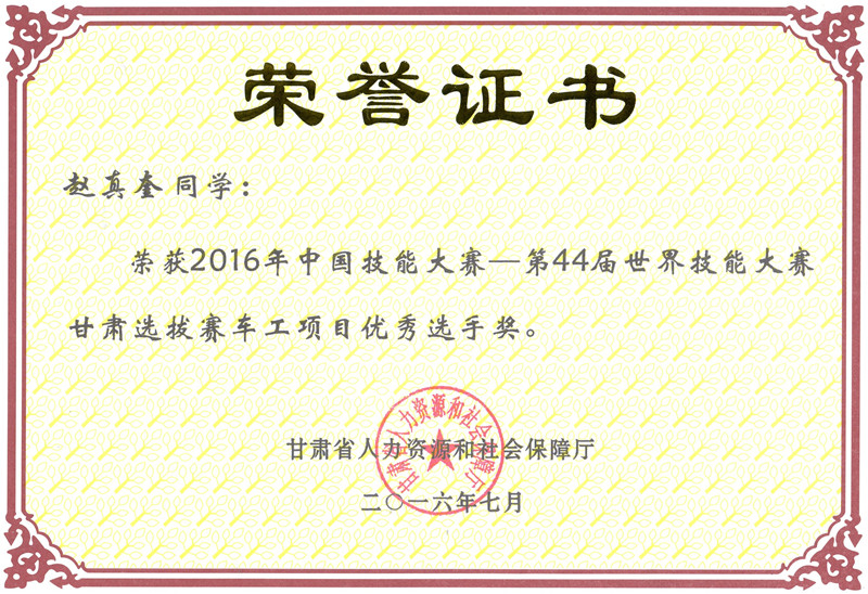 第44届世界技能大赛甘肃选拔赛车工项目优秀奖