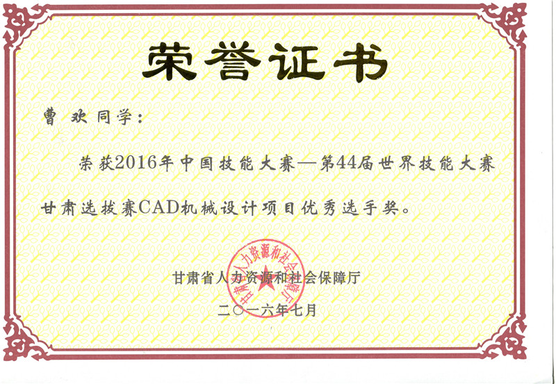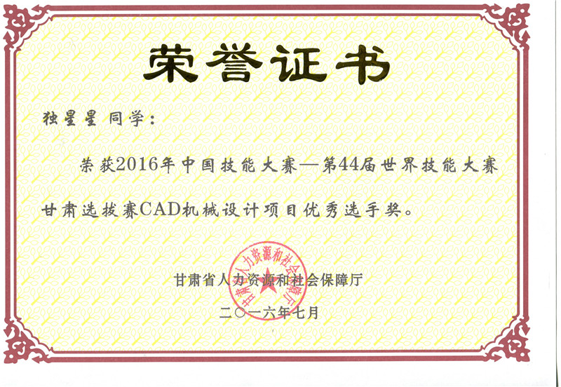 2016年中国技能大赛甘肃选拔赛CAD机械设计项目优秀奖