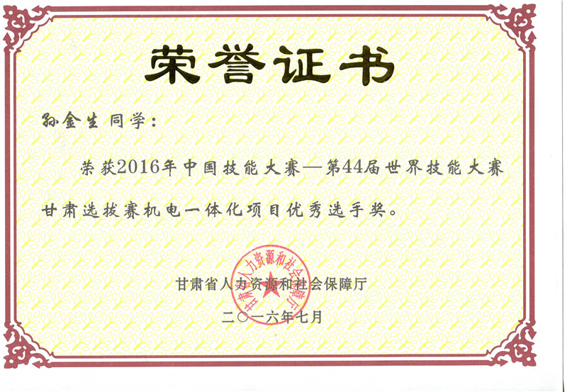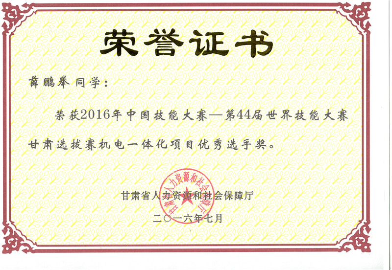 2016年中国技能大赛甘肃选拔赛机电一体化技术项目优秀奖