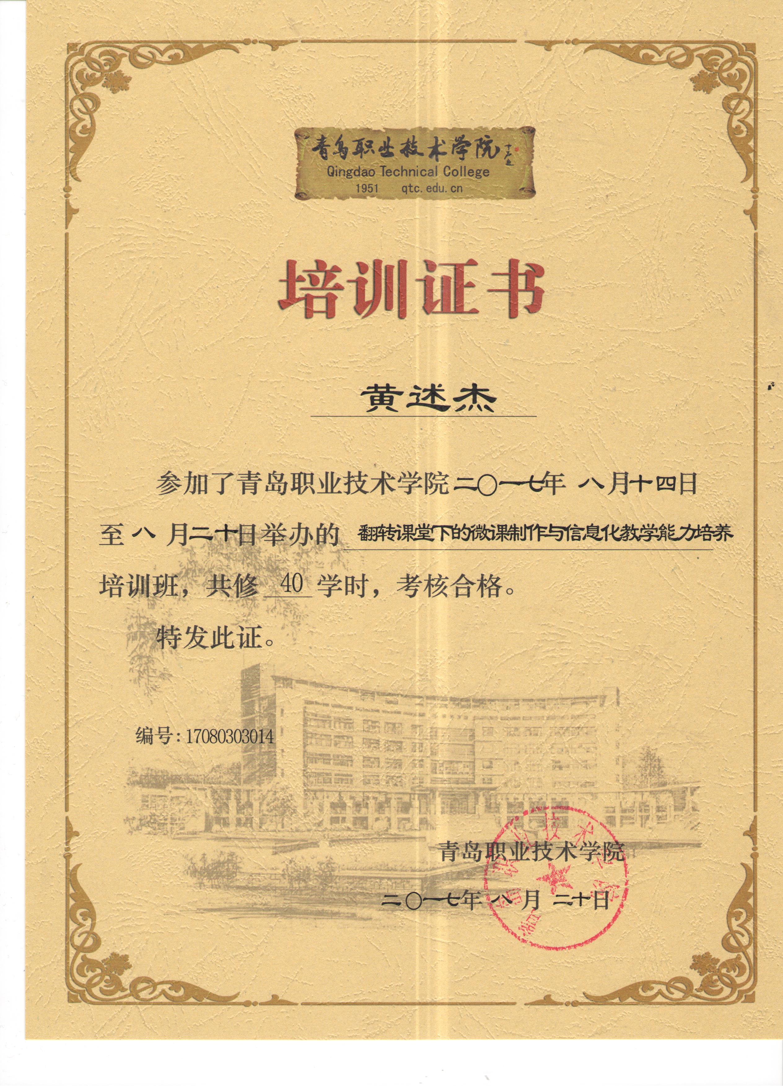 2017年8月15日至8月20日,我参加了由青岛职业技术学院举办的暑期《翻转课堂下的微课制作与信息化教学能力培养》培训班。本次培训青岛职业技术学院魏伟教授主讲。魏伟教授是2015年全国职业院校信息化教学大赛教学设计一等奖获得者,2016山东省职业院校信息化教学大赛评委。