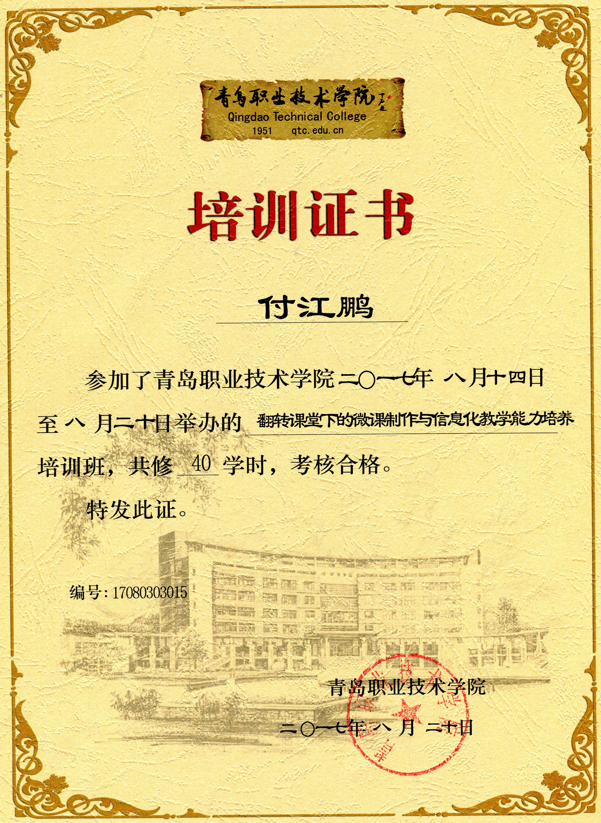 2017.8.14-8.20,我参加了由山东省教育厅在青岛职业技术学院举办的《高校教师教学能力、信息技术与专业素养提升高级培训班》联盟培训班。