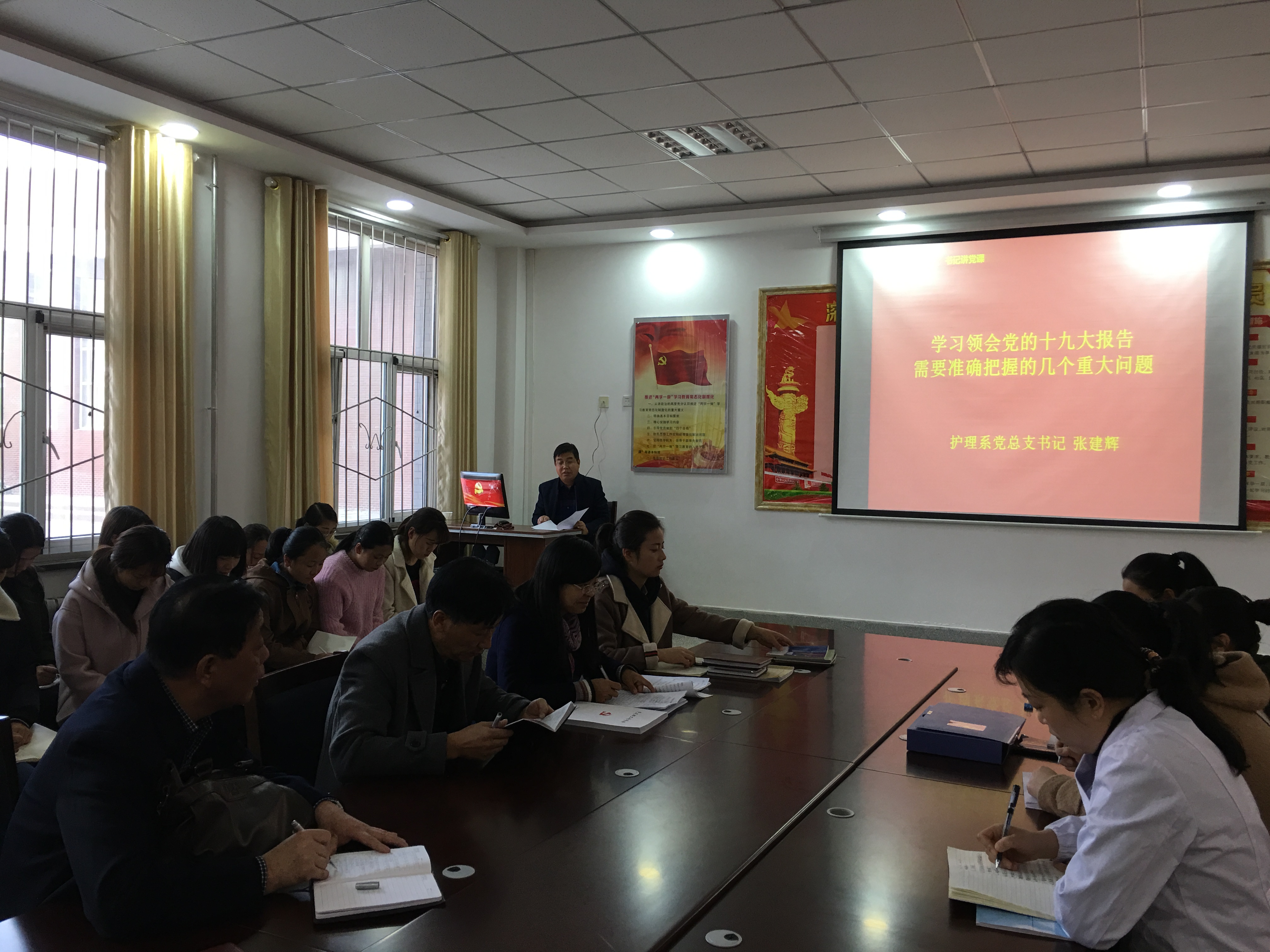 护理系党总支结合实际,利用多种形式组织党员学习和领会党的十九大精神,针对不同党员的实际情况,通过组织开展集中学习、党员自学、支部书记宣讲、专题研讨等形式将学习宣传贯彻党的十九大精神落到实处,同时将学习宣传贯彻党的十九大精神与我系教育教学工作相结合,加强基层党组织组织建设,推动优质高职院校建设工作全方面有序开展。