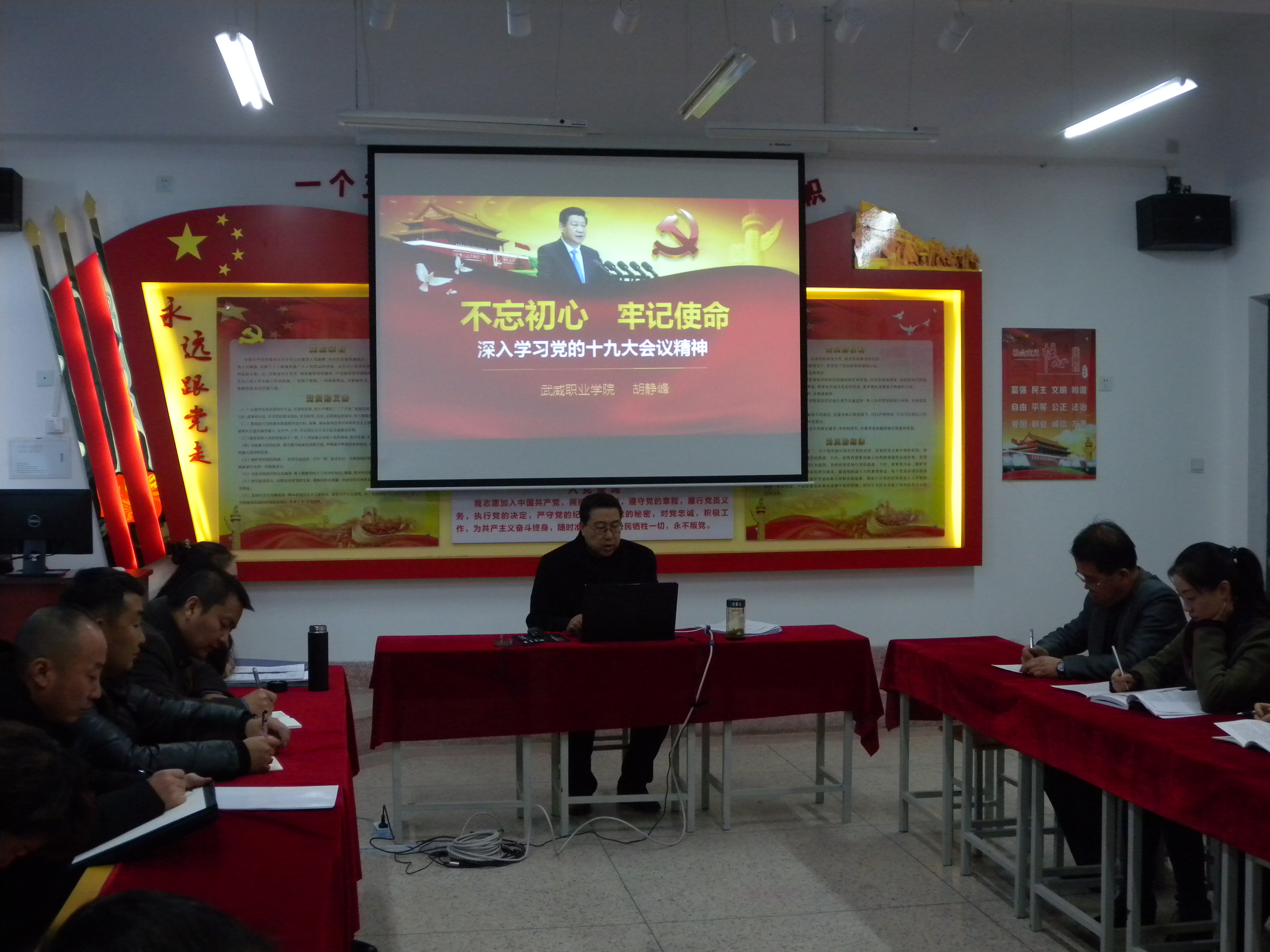 为深入学习党的十九大会议精神,人文艺术教育系党总支于2017年11月28日下午在励勤楼209党员活动室开展了书记讲党课活动。党课由胡静峰同志主讲,题目为《不忘初心 牢记使命--深入学习党的十九大会议精神》,全体党员参加了此次活动。